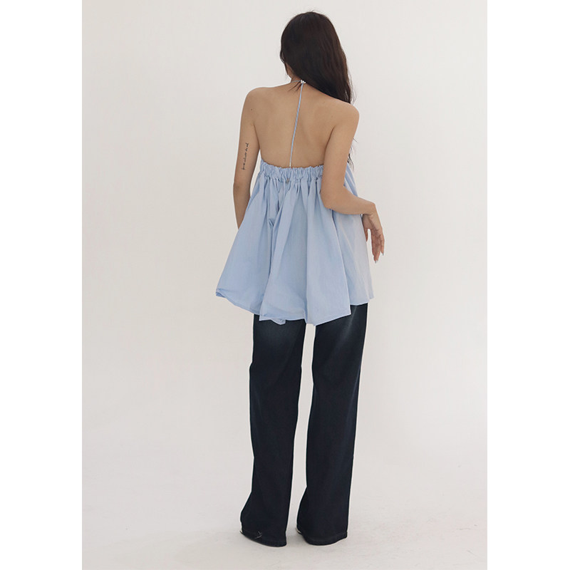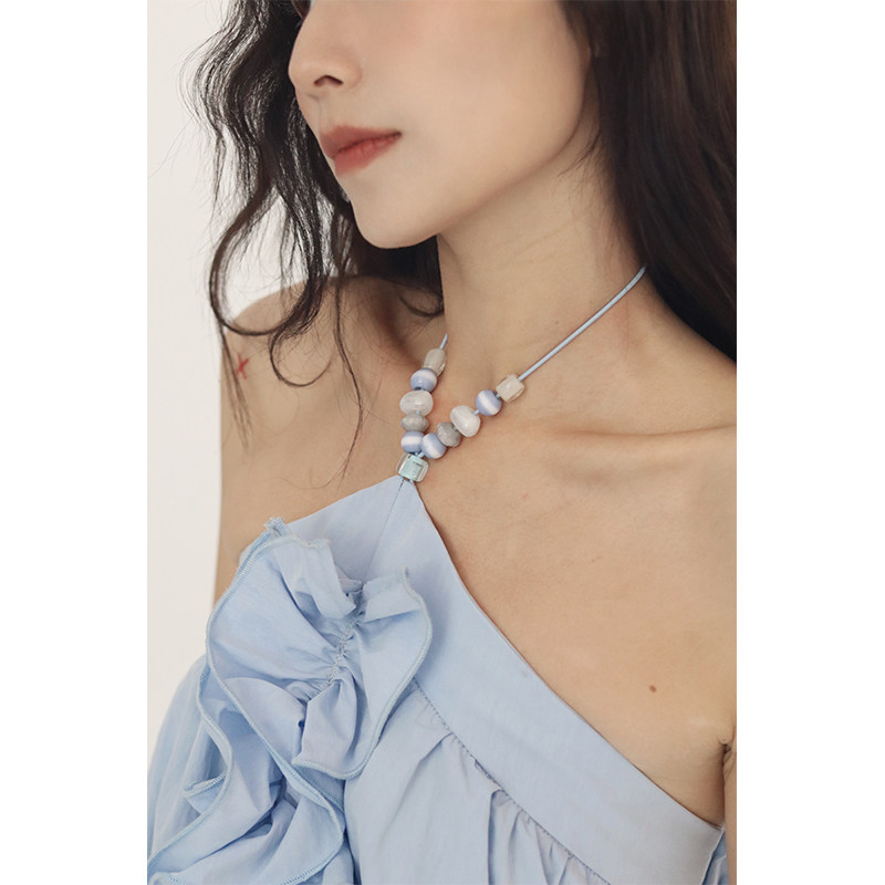 📚 無丛 NO SERVICE 立体花边串珠挂脖蓝色吊带 度假抹胸