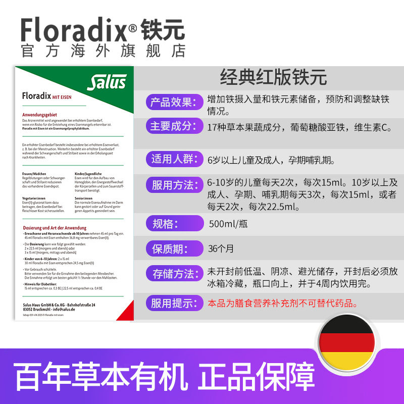 📚 Floradix 德国铁元孕妇孕期补铁铁剂女性气血口服液铁元素500ml*2