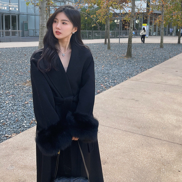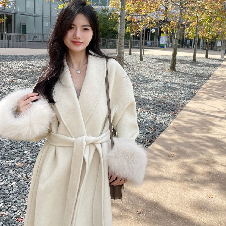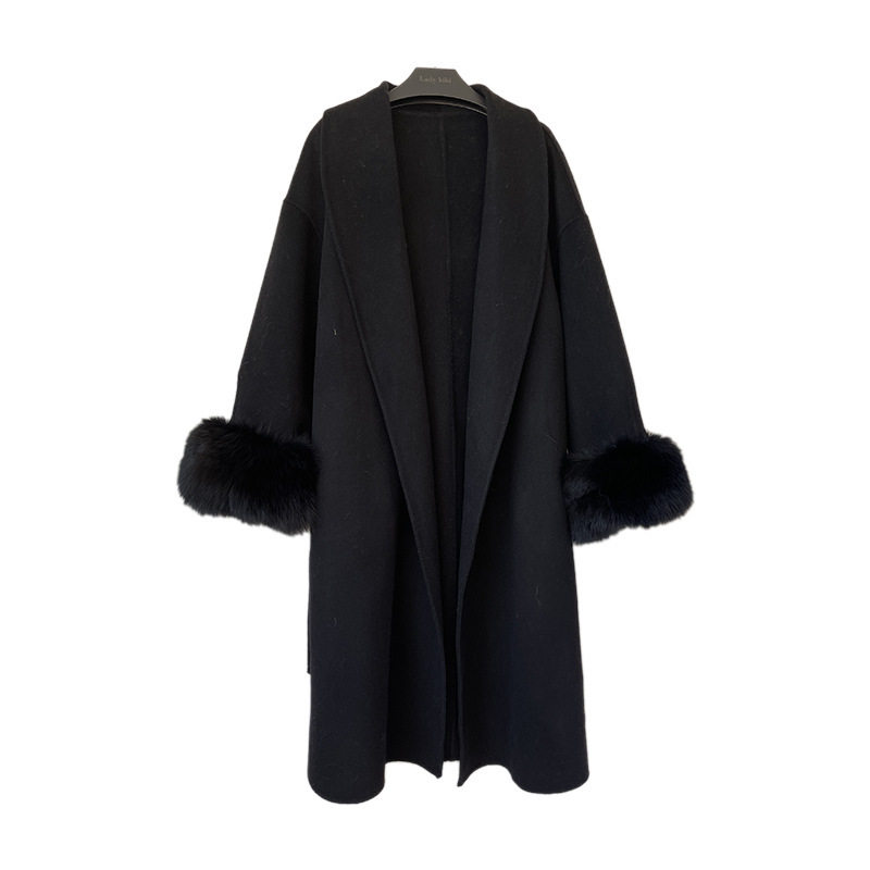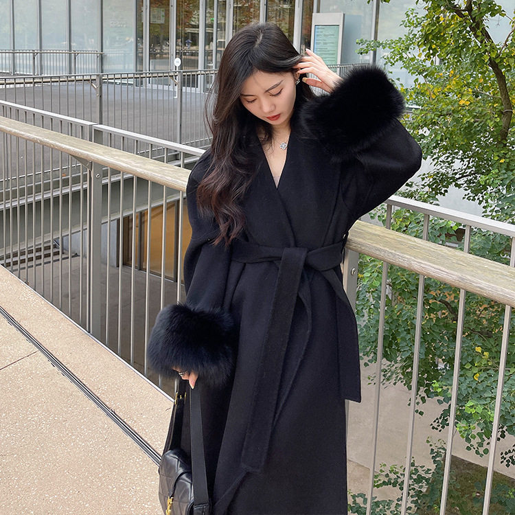 📚 周淼同款2024秋冬新款双面羊绒大衣女长款狐狸毛袖皮草外套