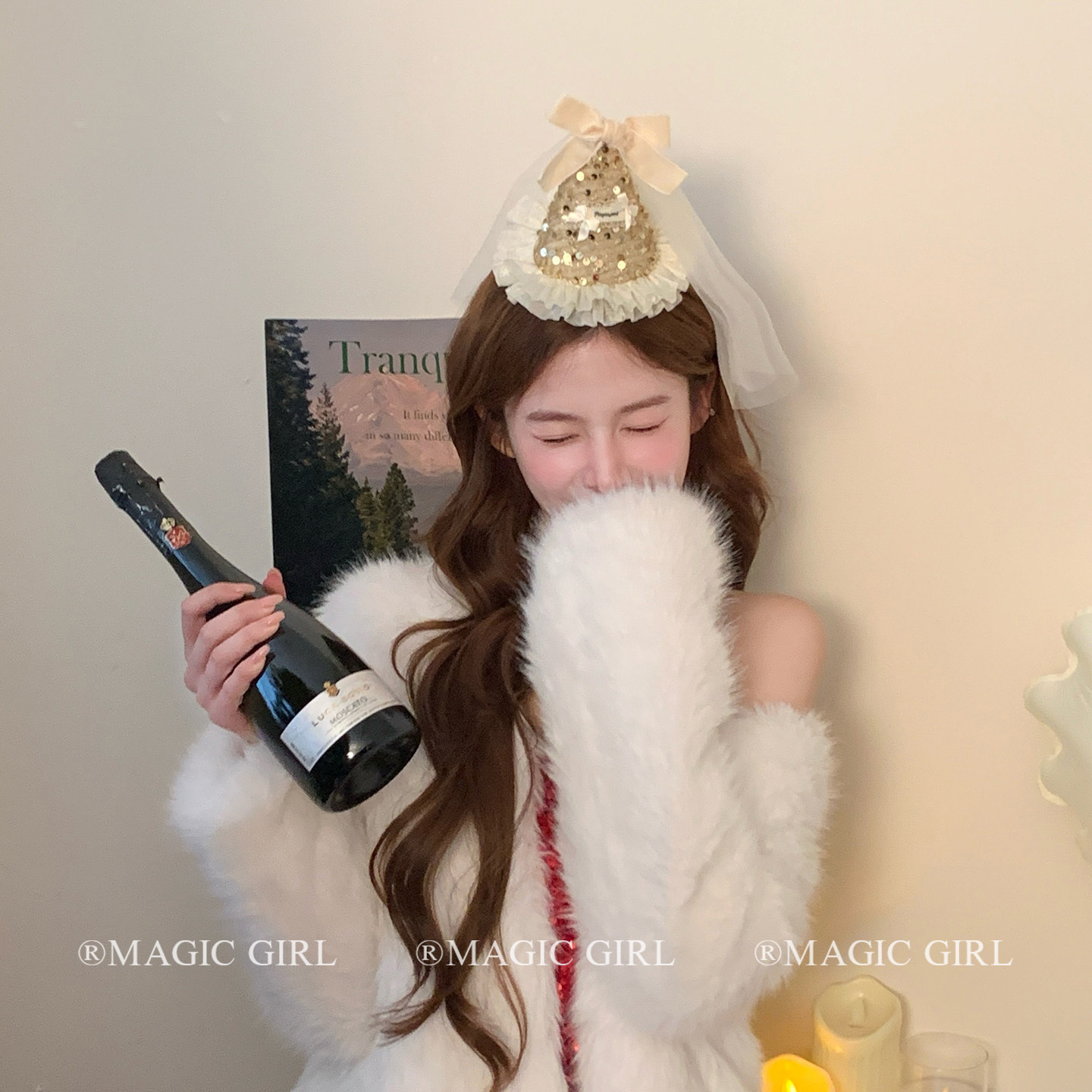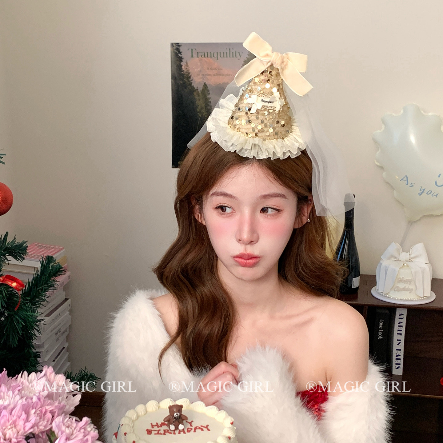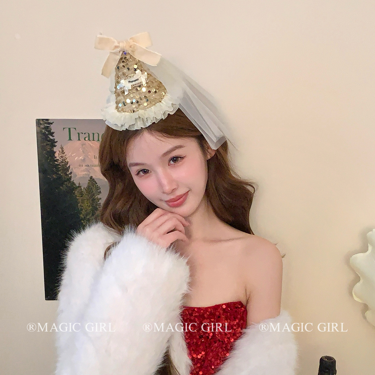 📚 千金帽子金色亮片蝴蝶结头纱生日帽发夹发饰圣诞节头饰氛围小礼帽