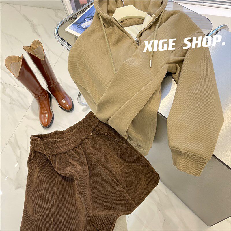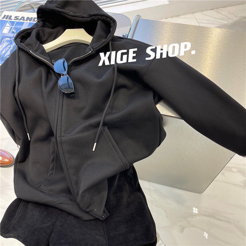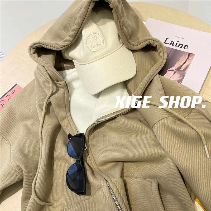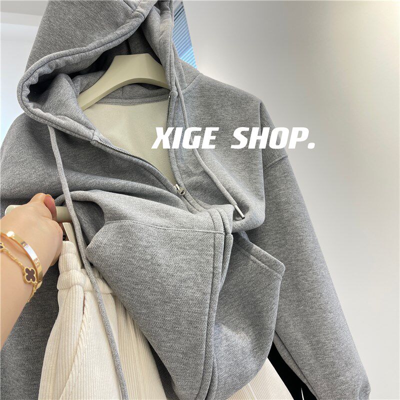 📚 灰色连帽卫衣外套女秋冬2022新款加绒加厚宽松休闲慵懒风拉链开衫