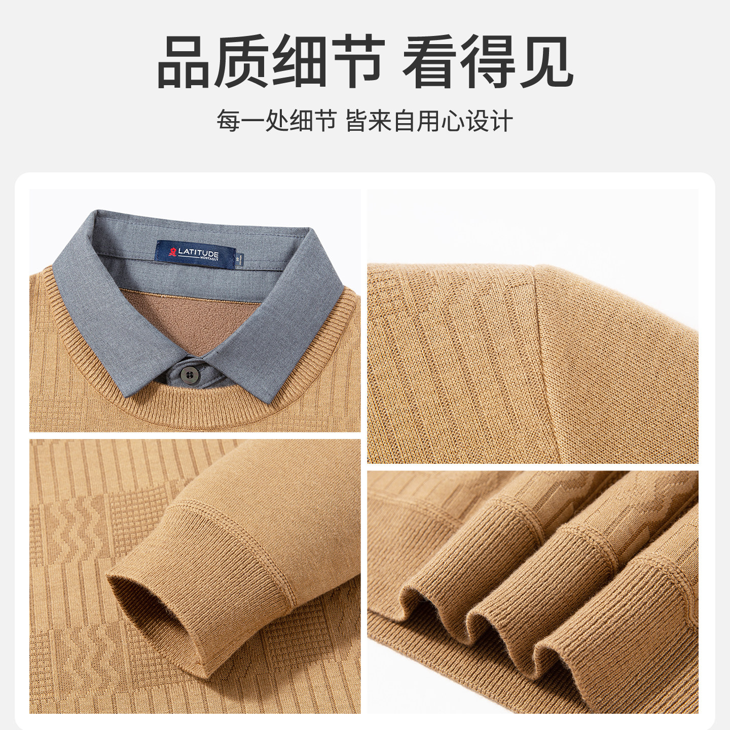 📚 轻奢提花-梦特娇男装秋冬季加绒毛衣男士假两件针织打底衫保暖款Z