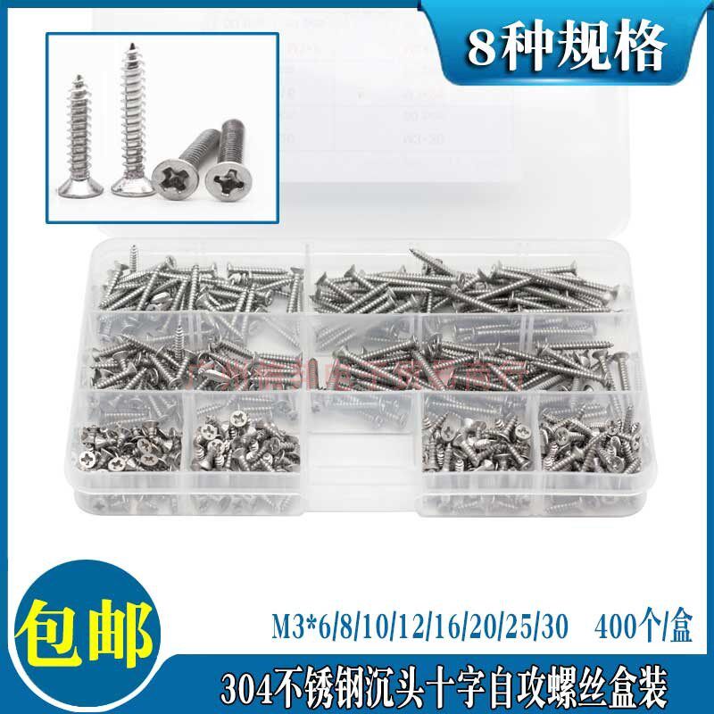 📚 400个不锈钢沉/平头十字自攻螺钉M3*6/8/10/12/16/20/25/30木螺丝