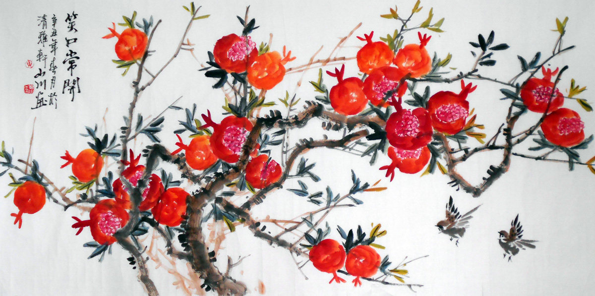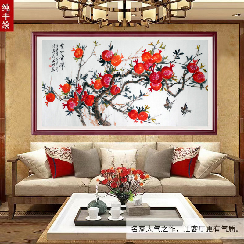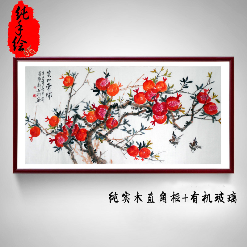 📚 纯手绘石榴树国画写意四尺横幅定制花鸟画石榴小鸟笑口常开装饰画