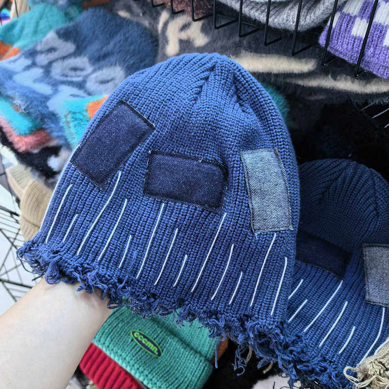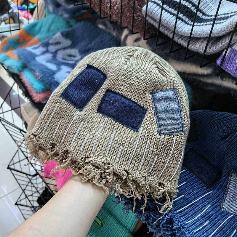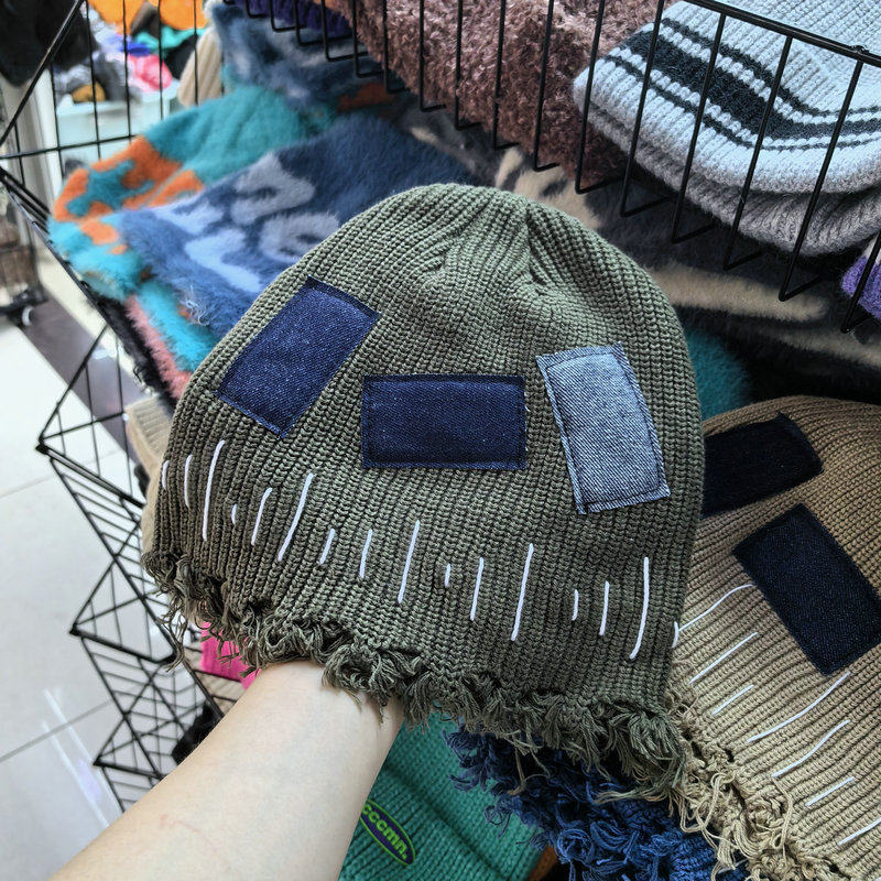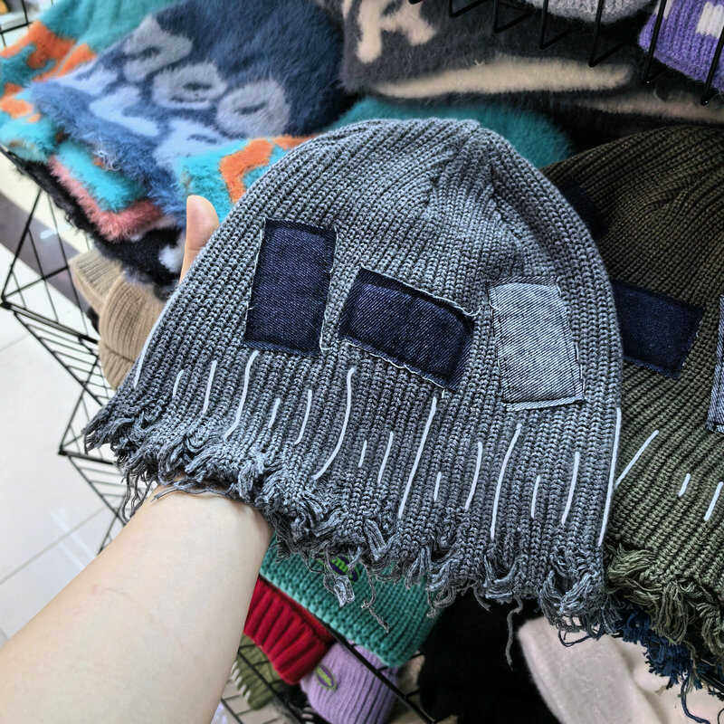 📚 秋冬新款时尚贴布破洞毛线帽子男休闲补丁乞丐风百搭针织套头冷帽