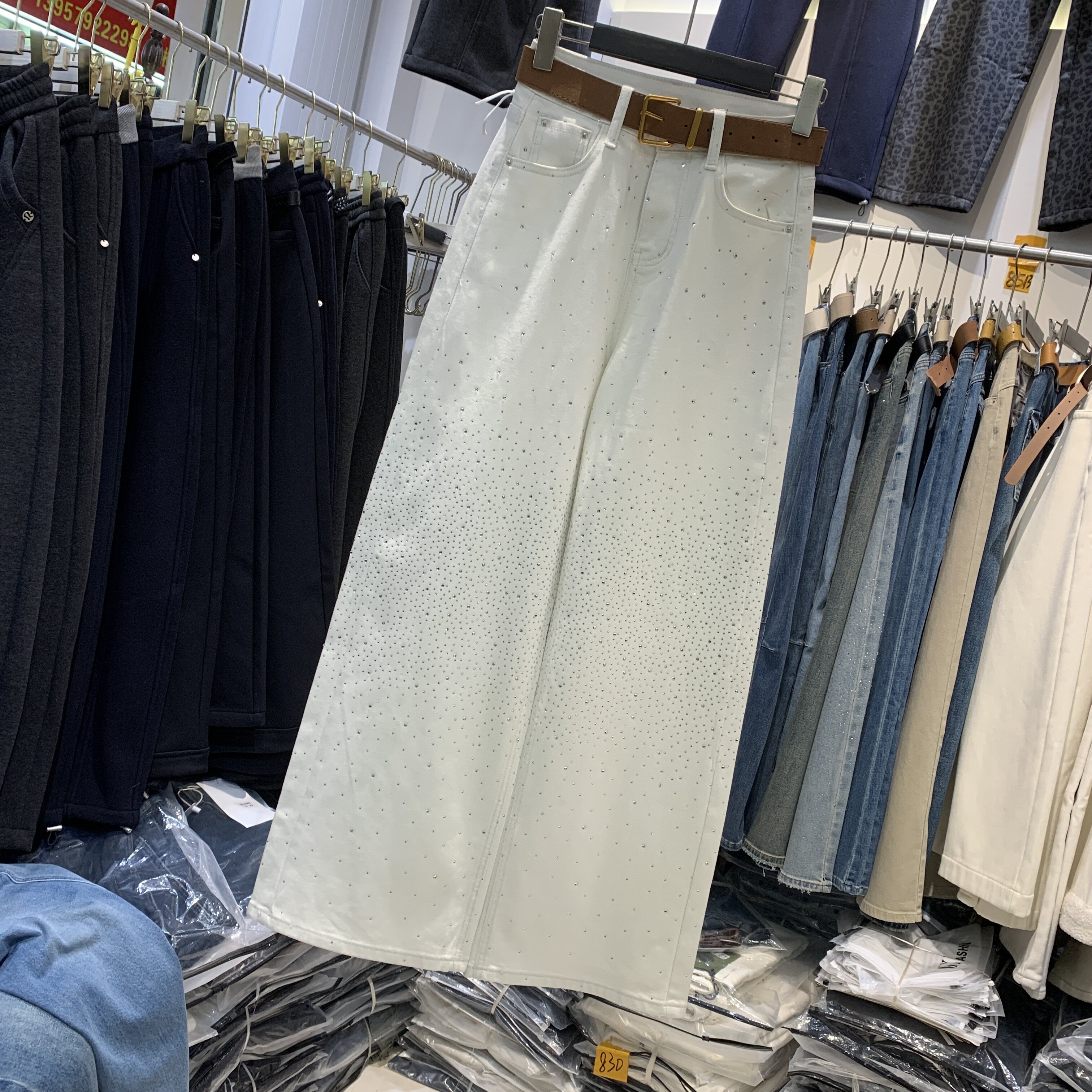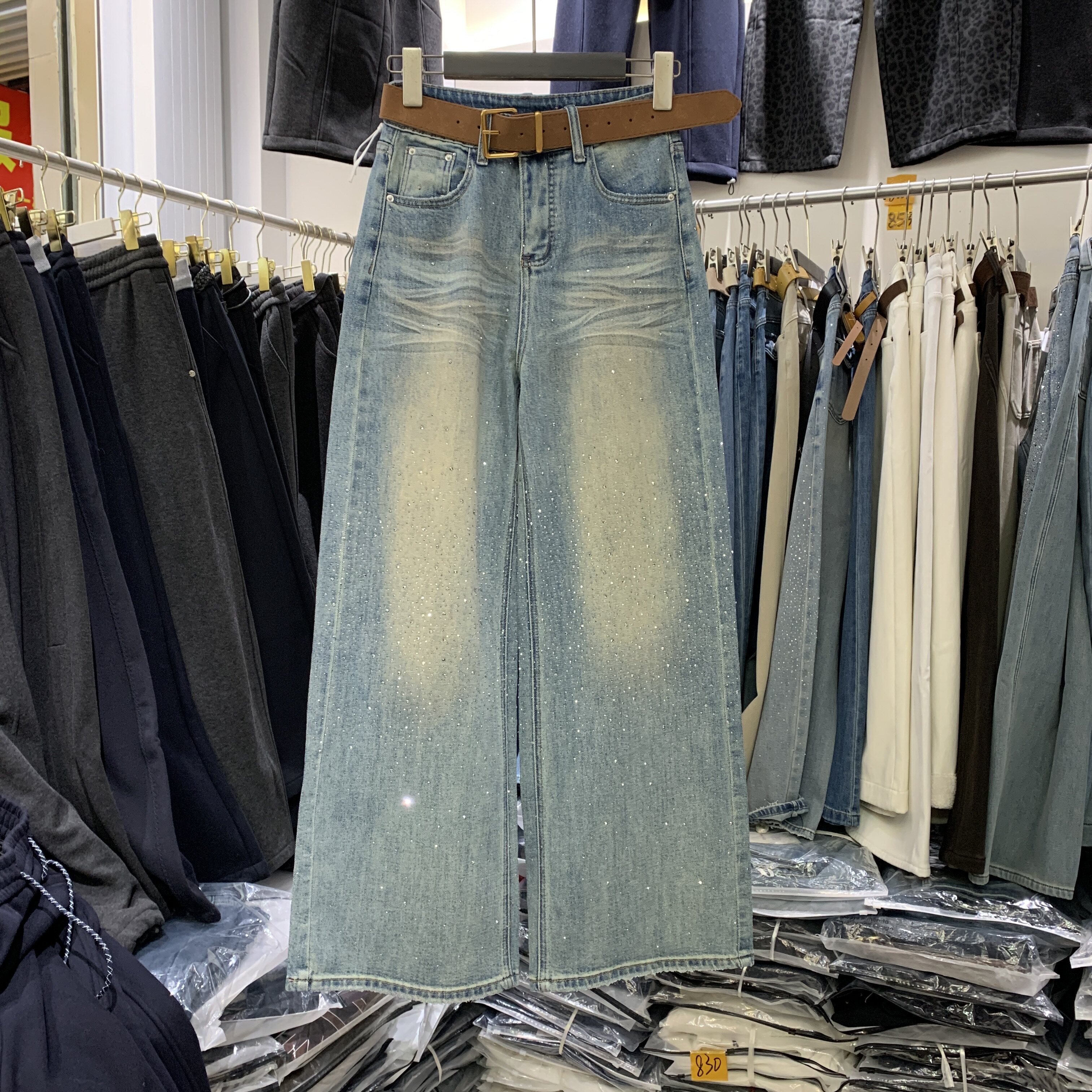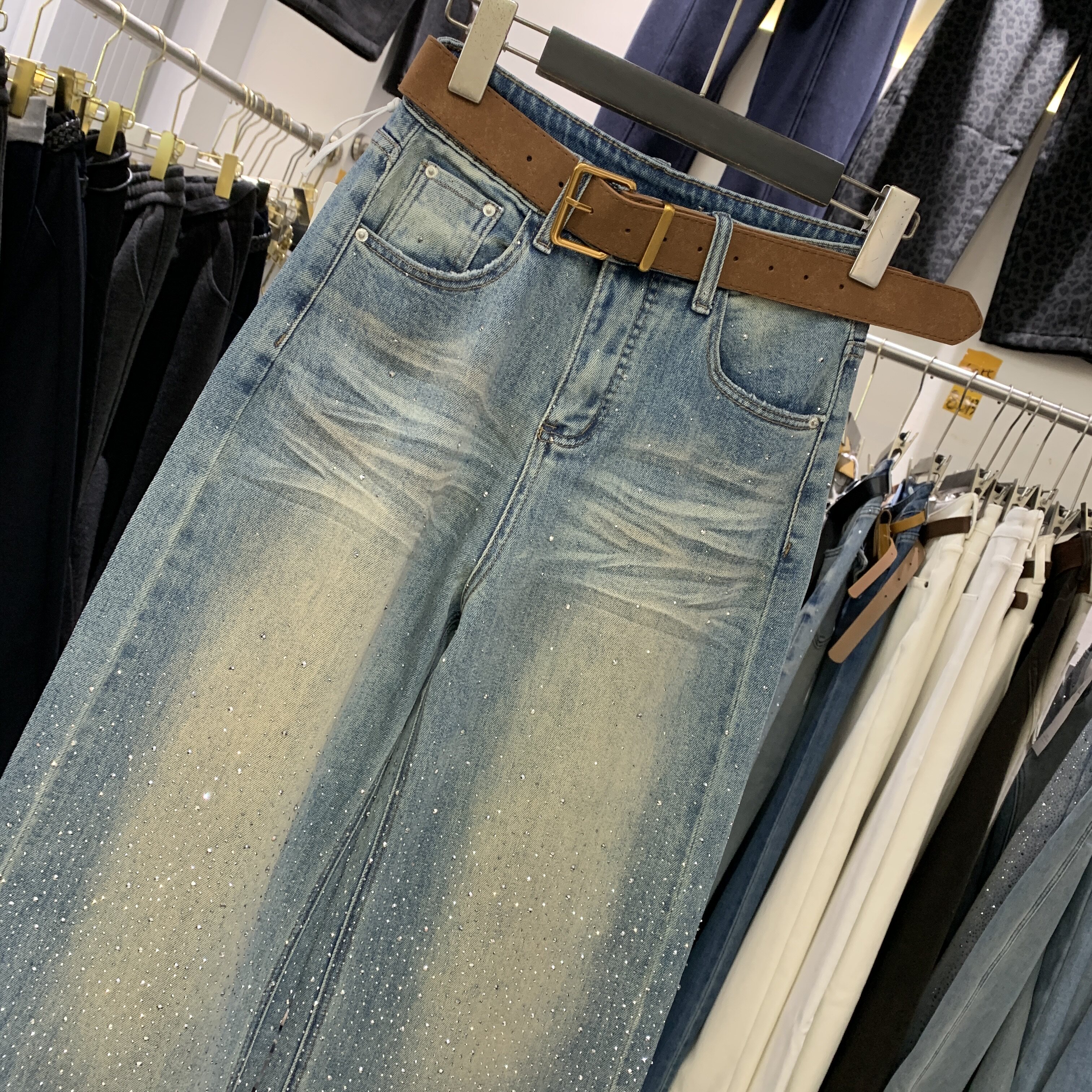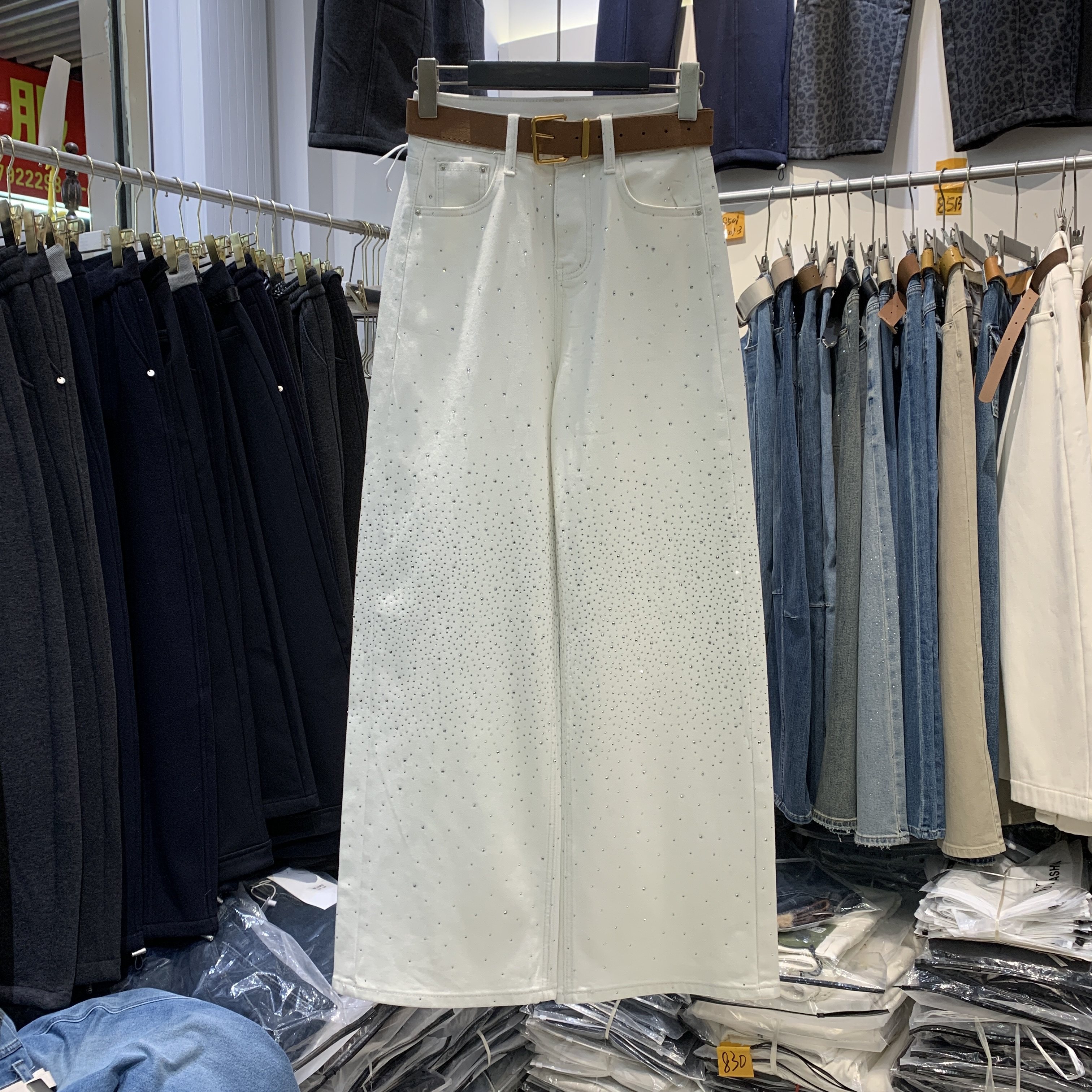 📚 Aiyueniao爱月鸟A8231-3春款弹力米白色烫钻女高腰直筒阔腿牛仔裤
