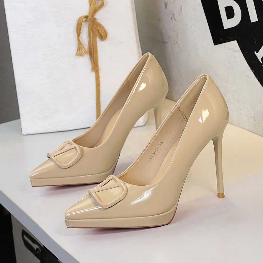 📚 公务员正装高跟鞋宴会高跟鞋女尖头浅口V扣漆皮防水台一脚蹬单鞋