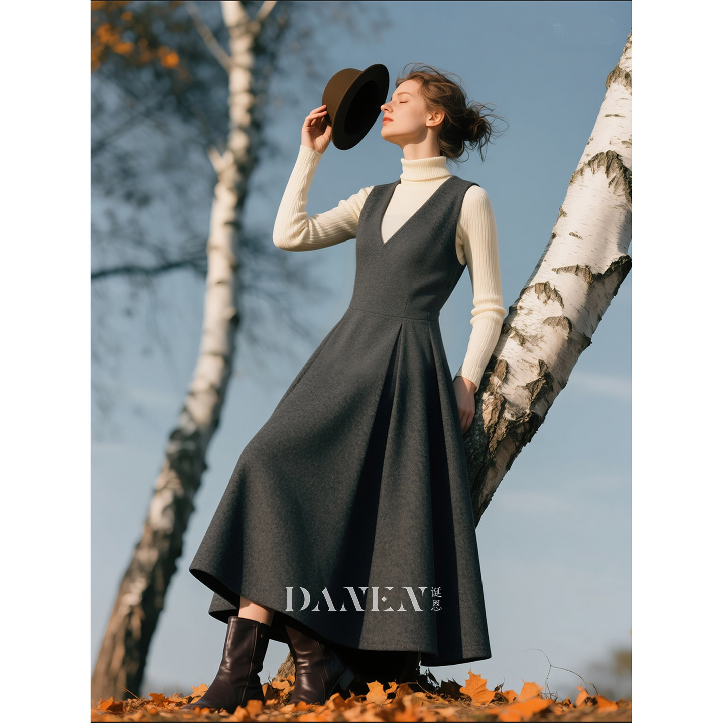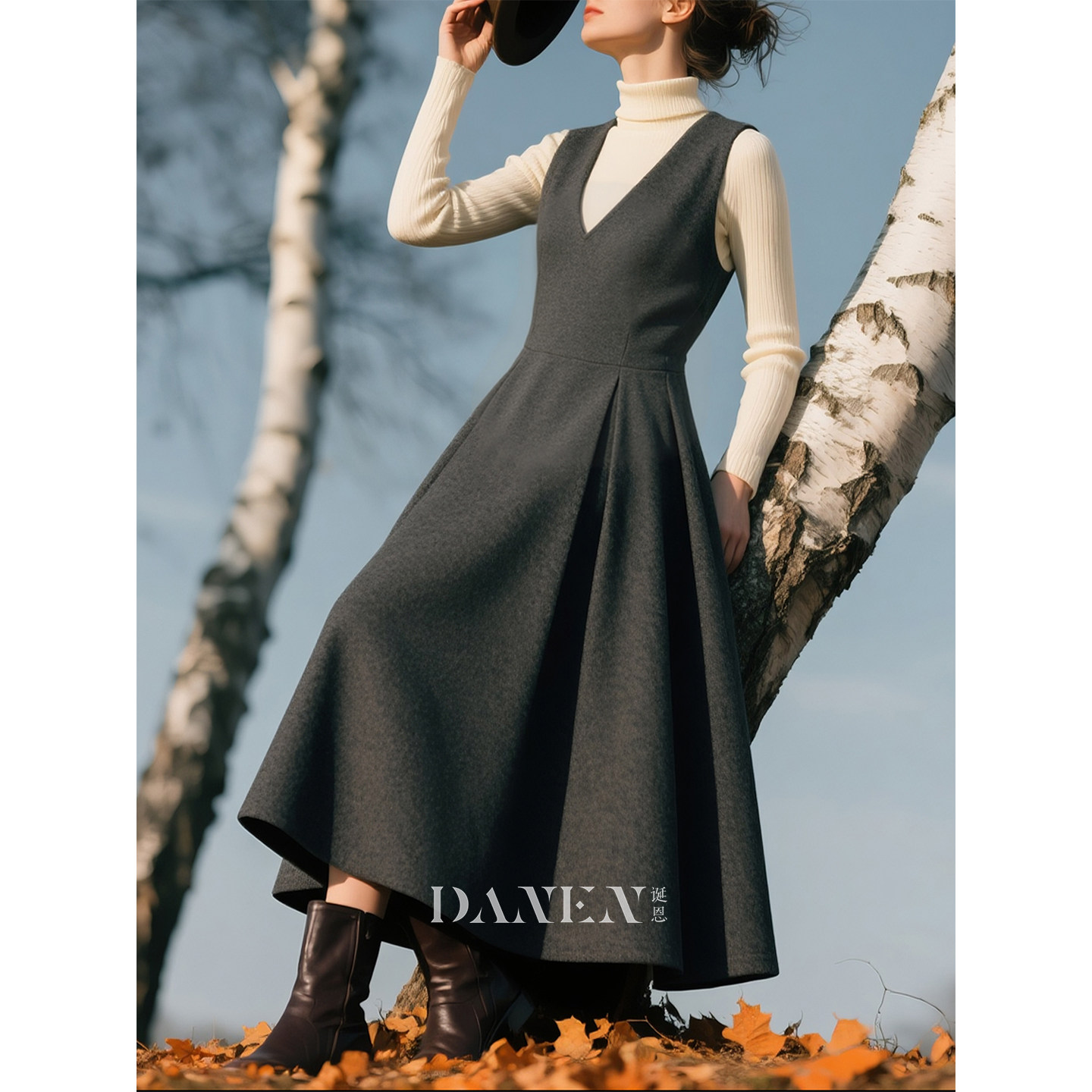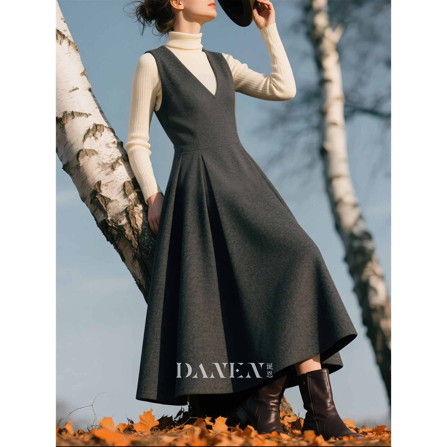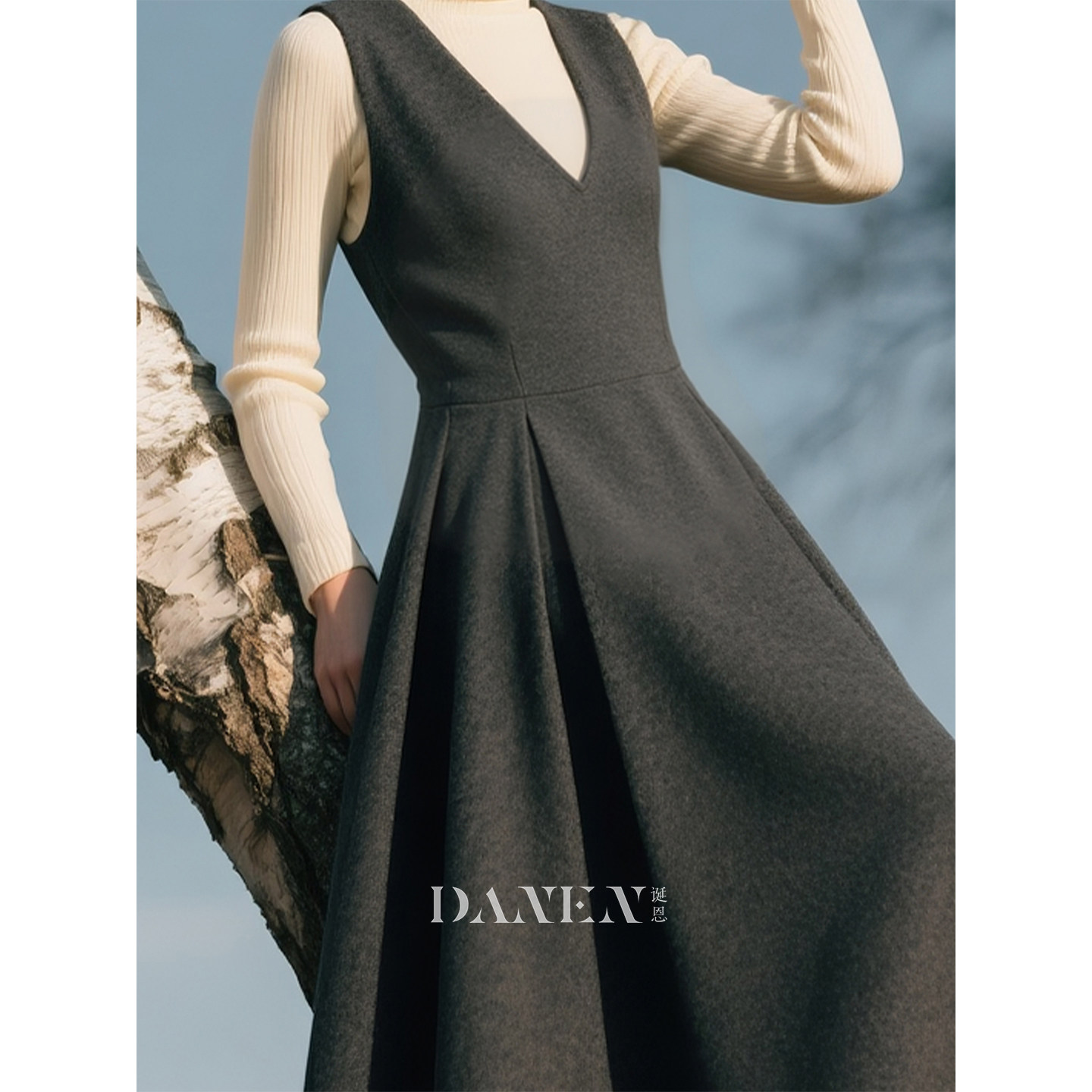 📚 深灰色毛呢V领背带连衣裙女2026年秋冬新款温柔大方叠穿A字裙