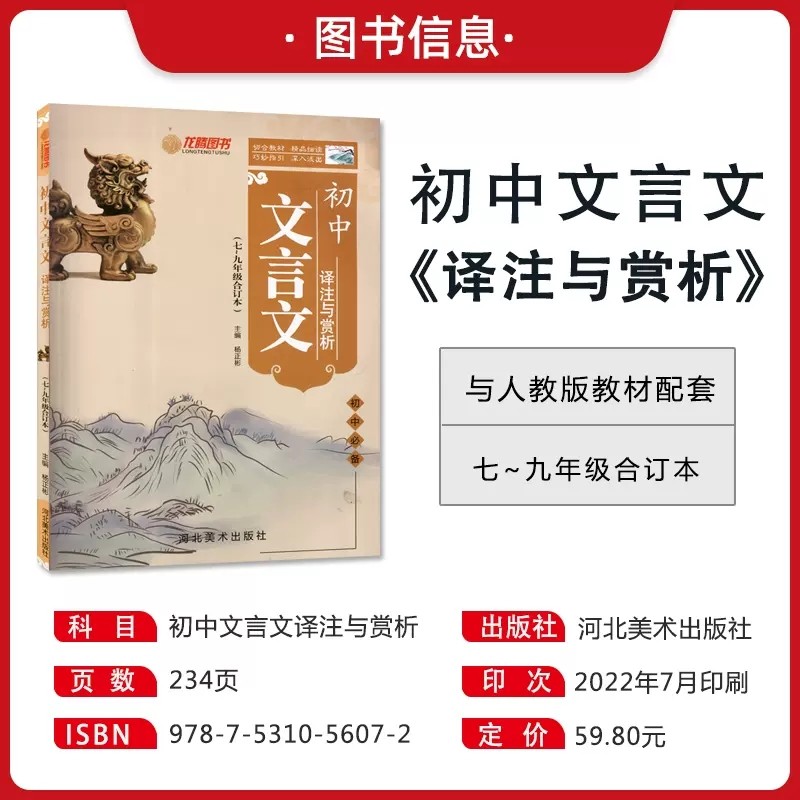 19¥ CZ001 gDxLUjvY9ws¥ https://m.tb.cn/h.7tWg8WA 龙腾图书初中文言文译注与赏析人教版RJ 2023版初中生文言文七八九年级合订版同步教材课文译注及评析中考古代文化常识789年级上下 --------------------- 【原售价】59.8元 【现售价】29.6元。