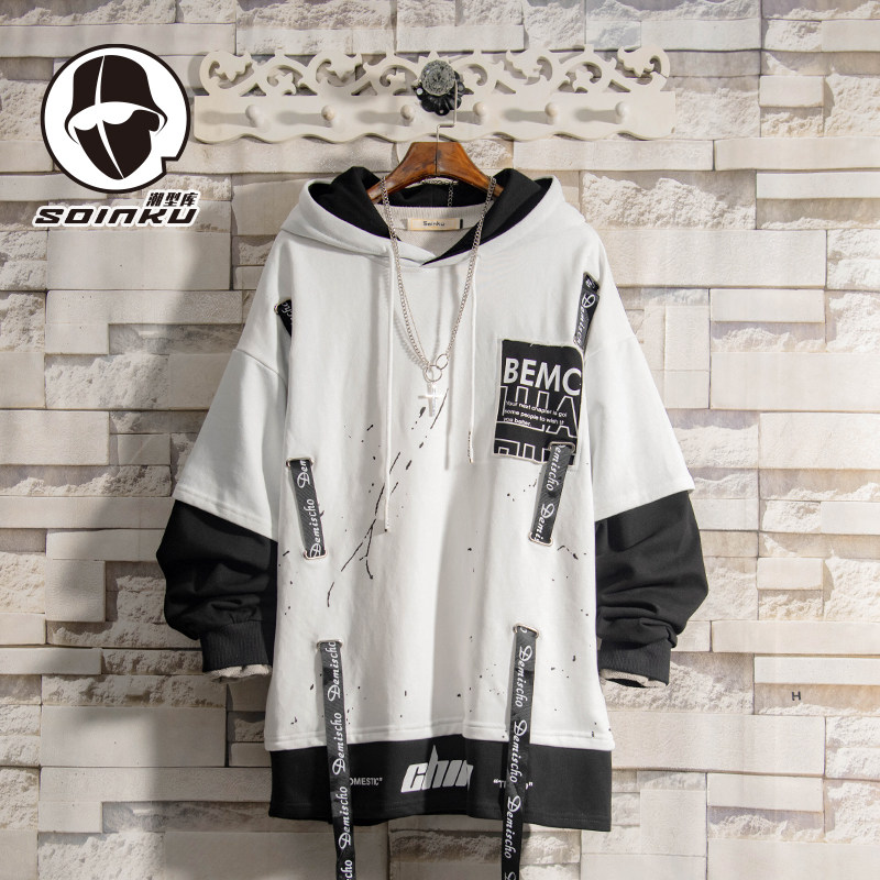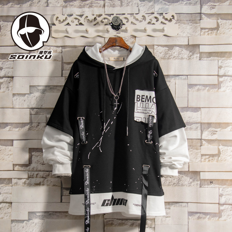 📚 SOINKU潮牌街头拼接假两件初冬巨好看的连帽卫衣中性风男生COS潮