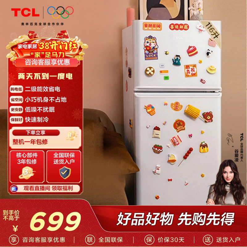 📚 TCL 116升迷你双门电冰箱白色二级能效节能低音宿舍租房小型家用