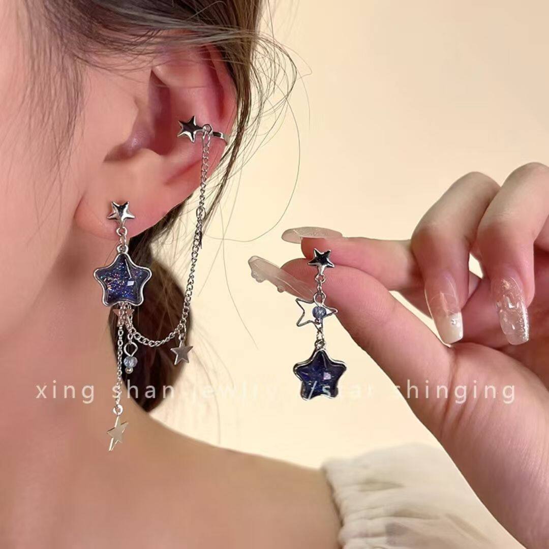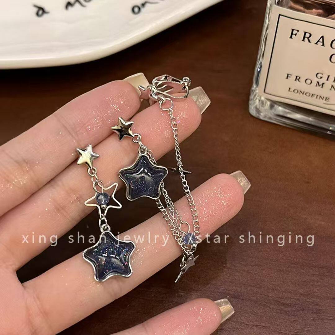 📚 新款不对称蓝色星星流苏耳夹无耳洞耳环小众简约五角星流苏耳夹女