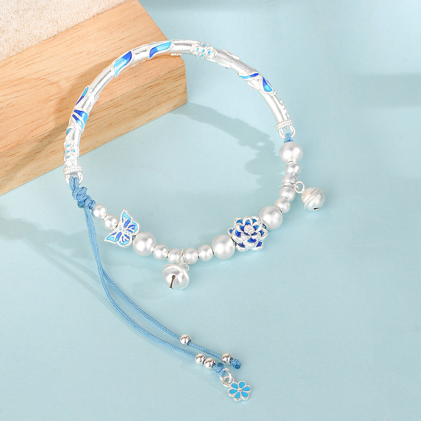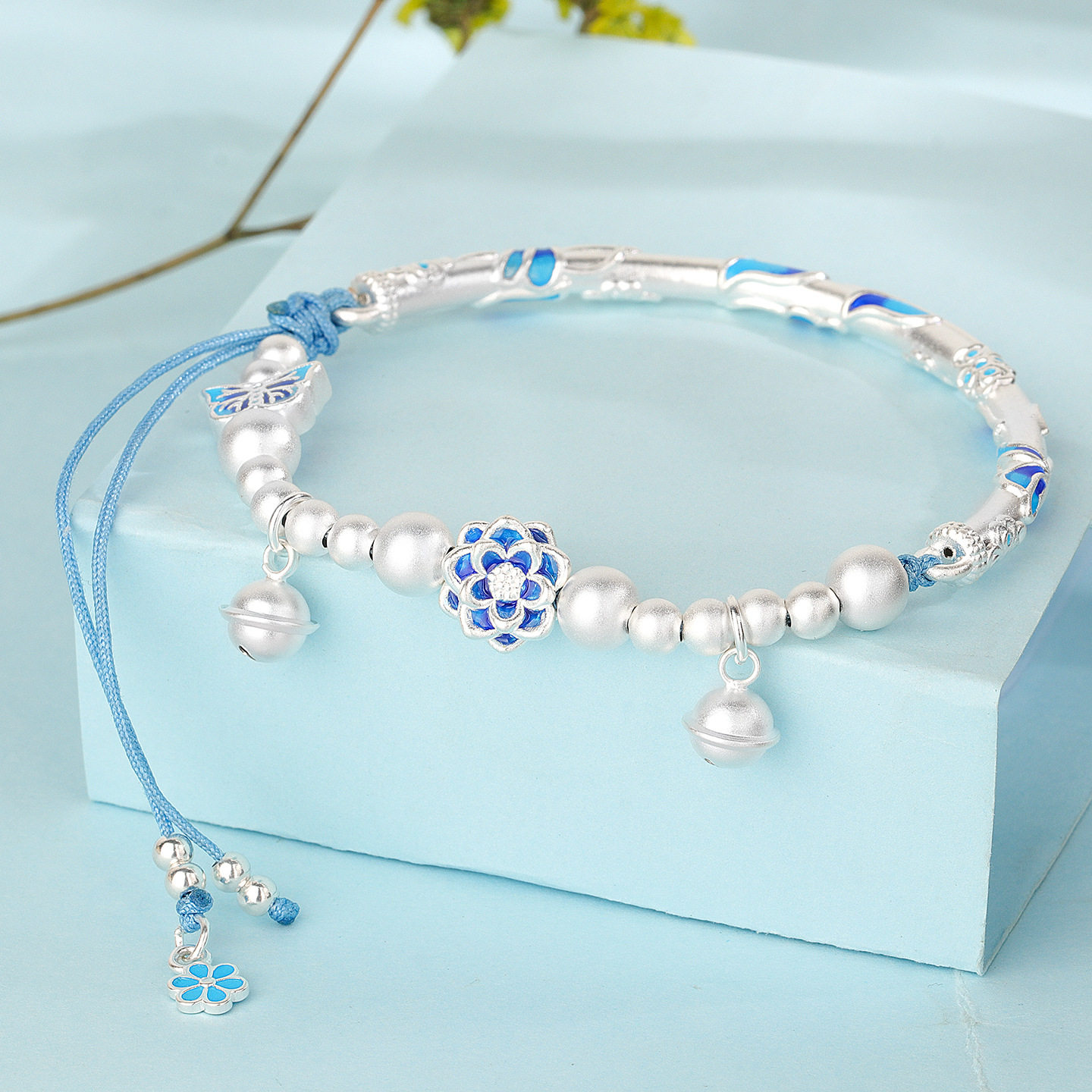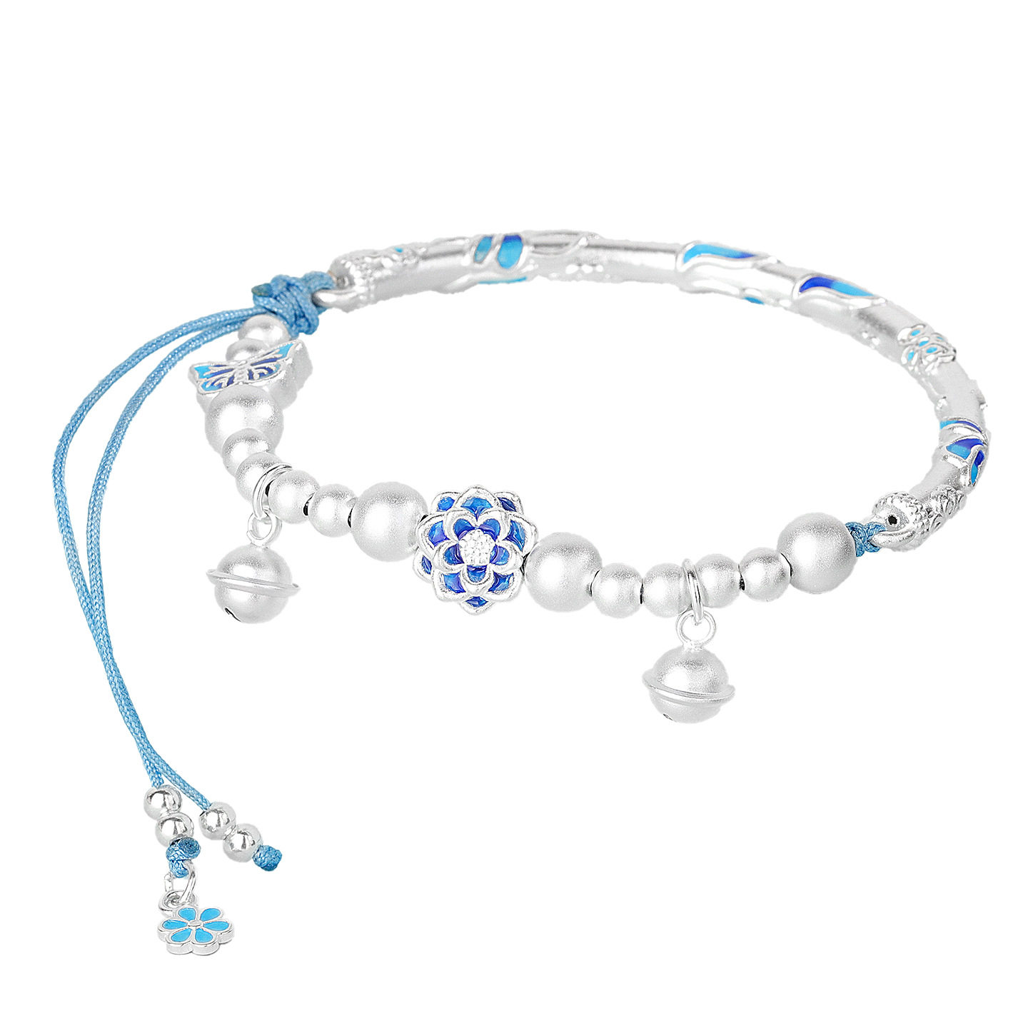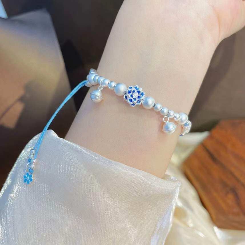 📚 s925纯银青花珐琅莲花半镯手链女小众素银磨砂手串小众设计感百搭