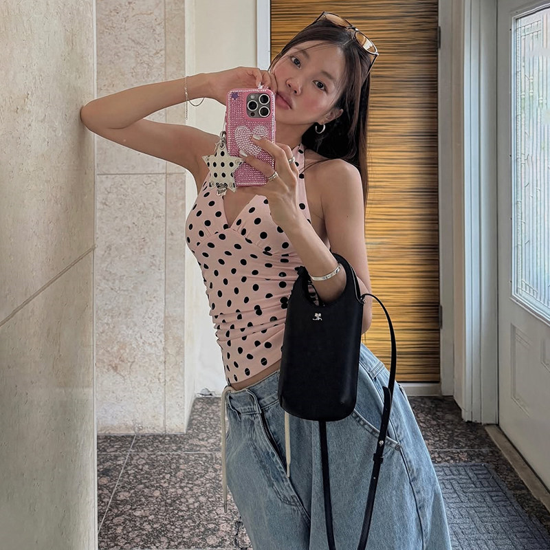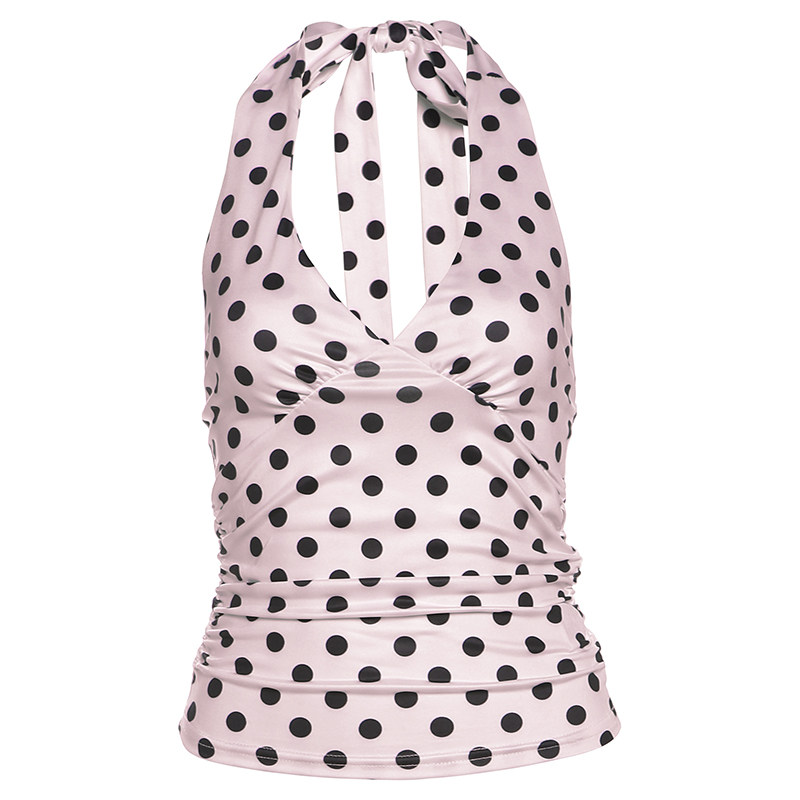 📚 #Sisjuly#曼谷高街少女粉色波点印花V领挂脖式吊带女修身百搭背心