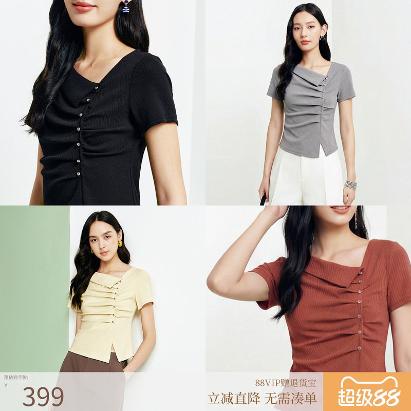 09¥ HU071 PM3k5hpY1q7¥ https://m.tb.cn/h.iJsyaX9 FS休闲一字斜翻领不规则下摆短袖T恤衫上衣26春夏新款女装5327A --------------------- 【原售价】1,299元 【现售价】570元。