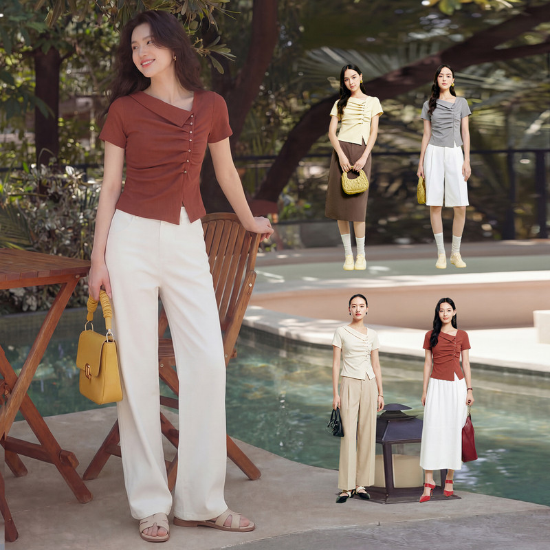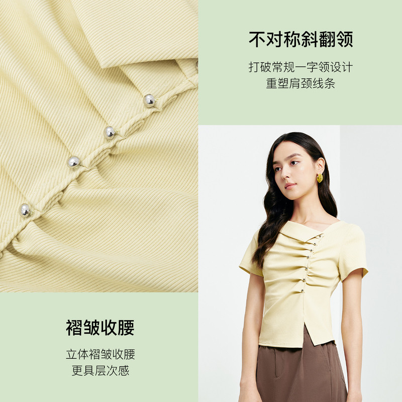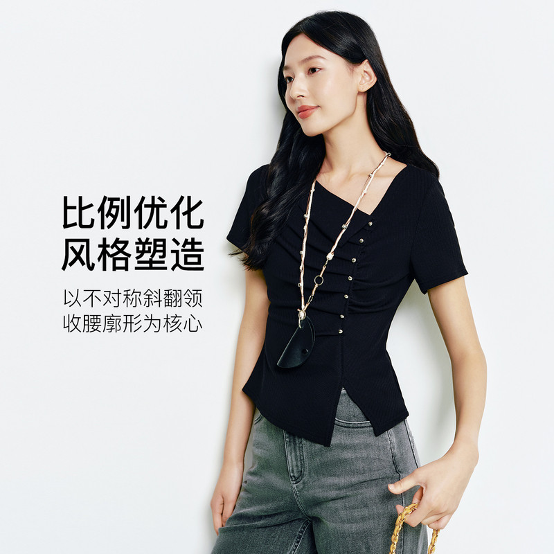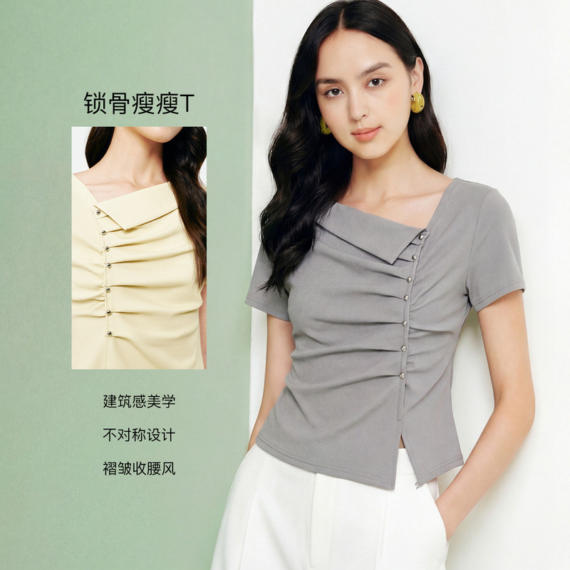 📚 FS休闲一字斜翻领不规则下摆短袖T恤衫上衣26春夏新款女装5327A