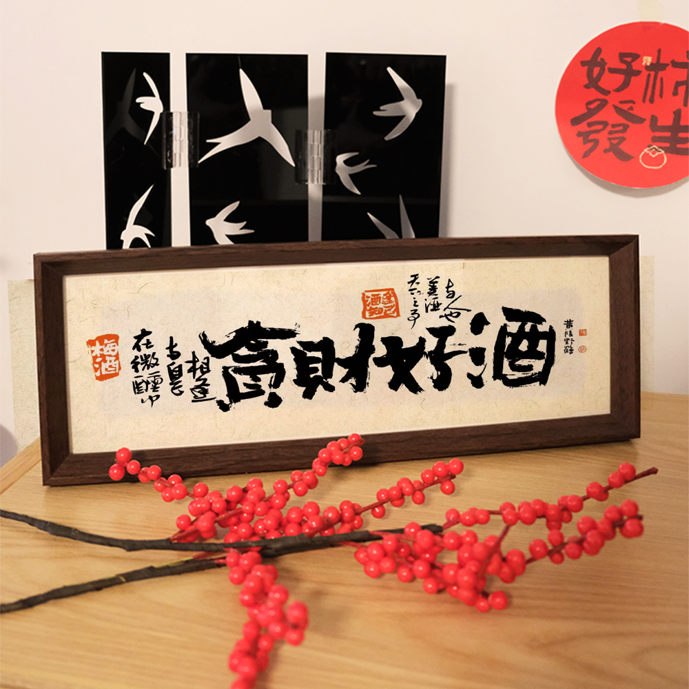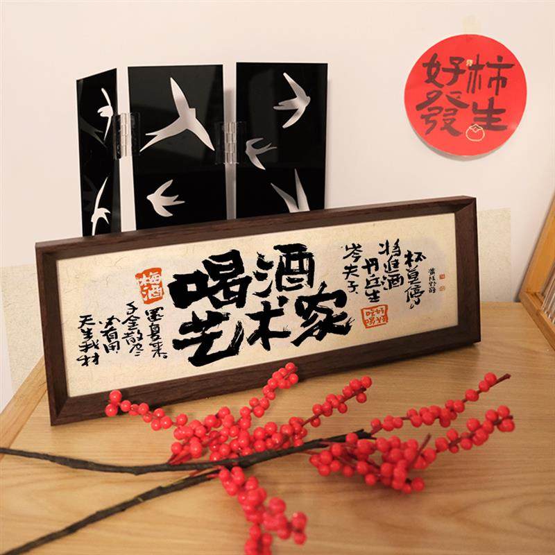 📚 按时喝酒中式书法国潮相框实木桌面摆台字画卧室摆件酒吧歌厅装饰