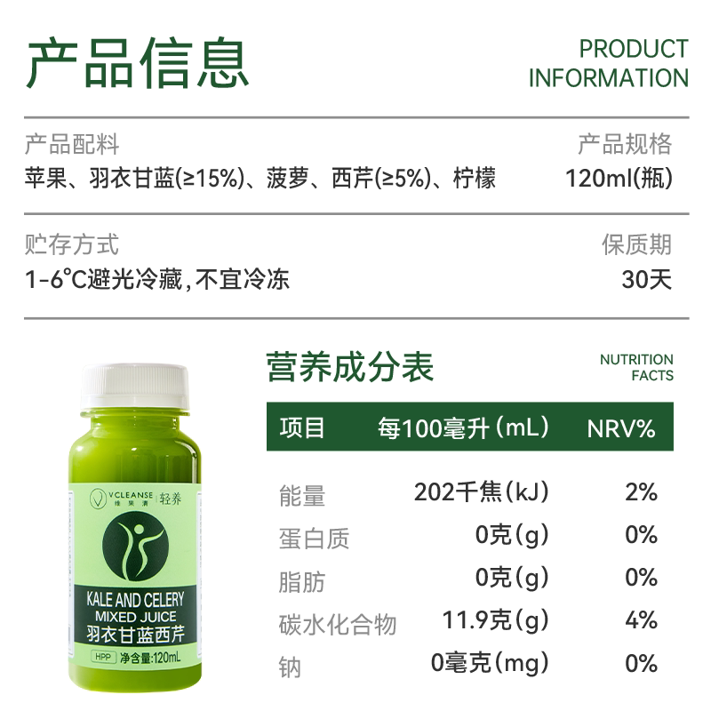 📚 维果清羽衣甘蓝西芹汁 纯鲜榨HPP果蔬汁水果蔬菜汁液体沙拉果蔬汁