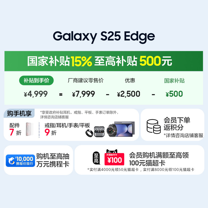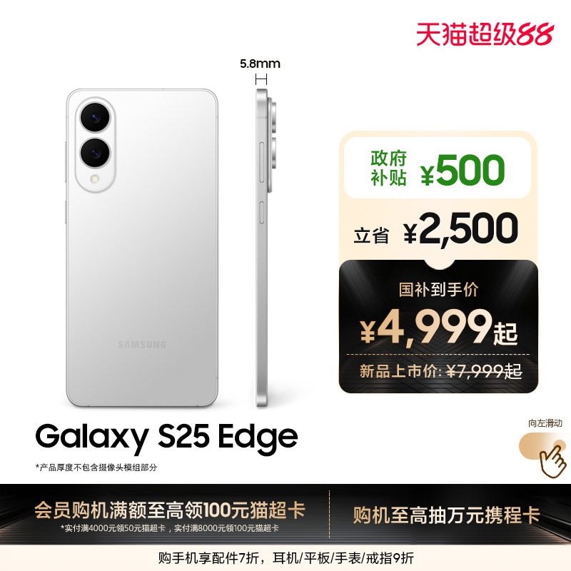 38¥ HU108 RPFg5So5DuU¥ https://m.tb.cn/h.irs3L00 【国家补贴500元】Samsung/三星Galaxy S25 Edge超轻薄机身2亿像素 AI智能拍照手机官方正品 --------------------- 【原售价】7,999元 【现售价】7,999元。