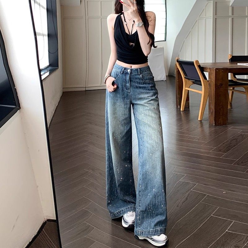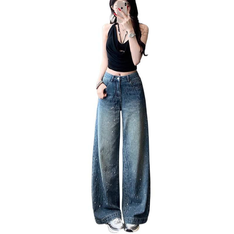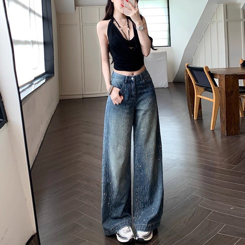 📚 李李服饰流星雨重工烫钻阔腿牛仔裤女2025年秋季高腰宽松显瘦长裤