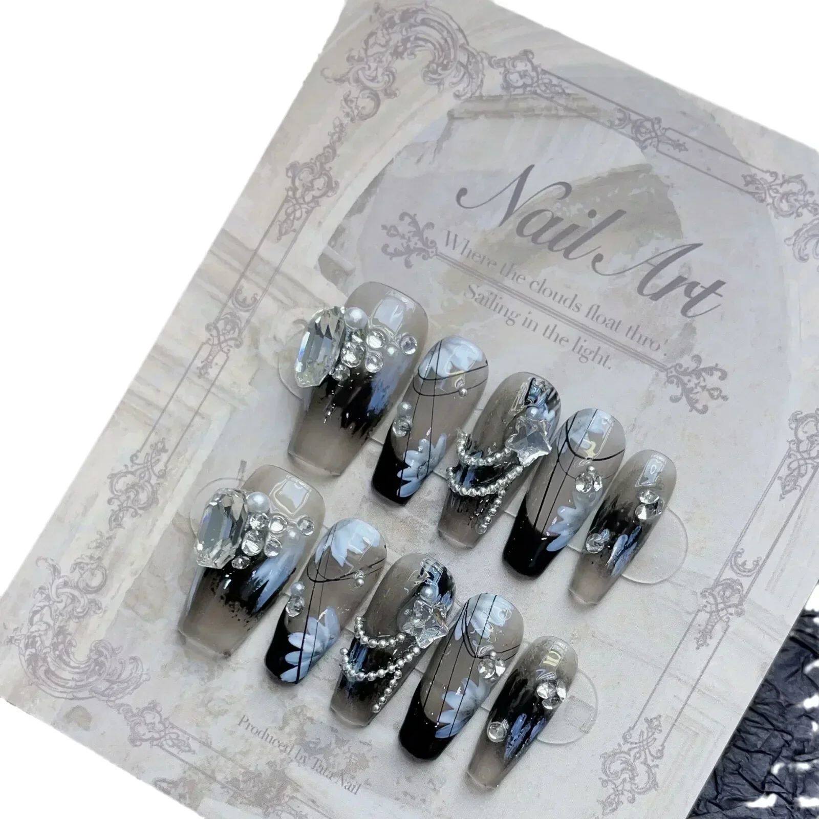 📚 10Pcs Black Handmade Press on Nails Flower Ballet Wearable R
