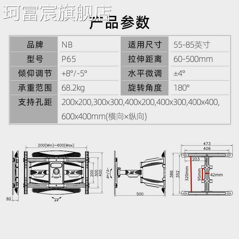 📚 珂富宸NB P65(55-85寸)通用电视支架 电视挂架 伸缩支架 旋转挂墙架床笠拉车