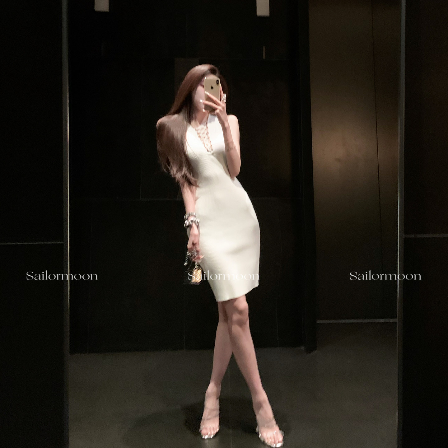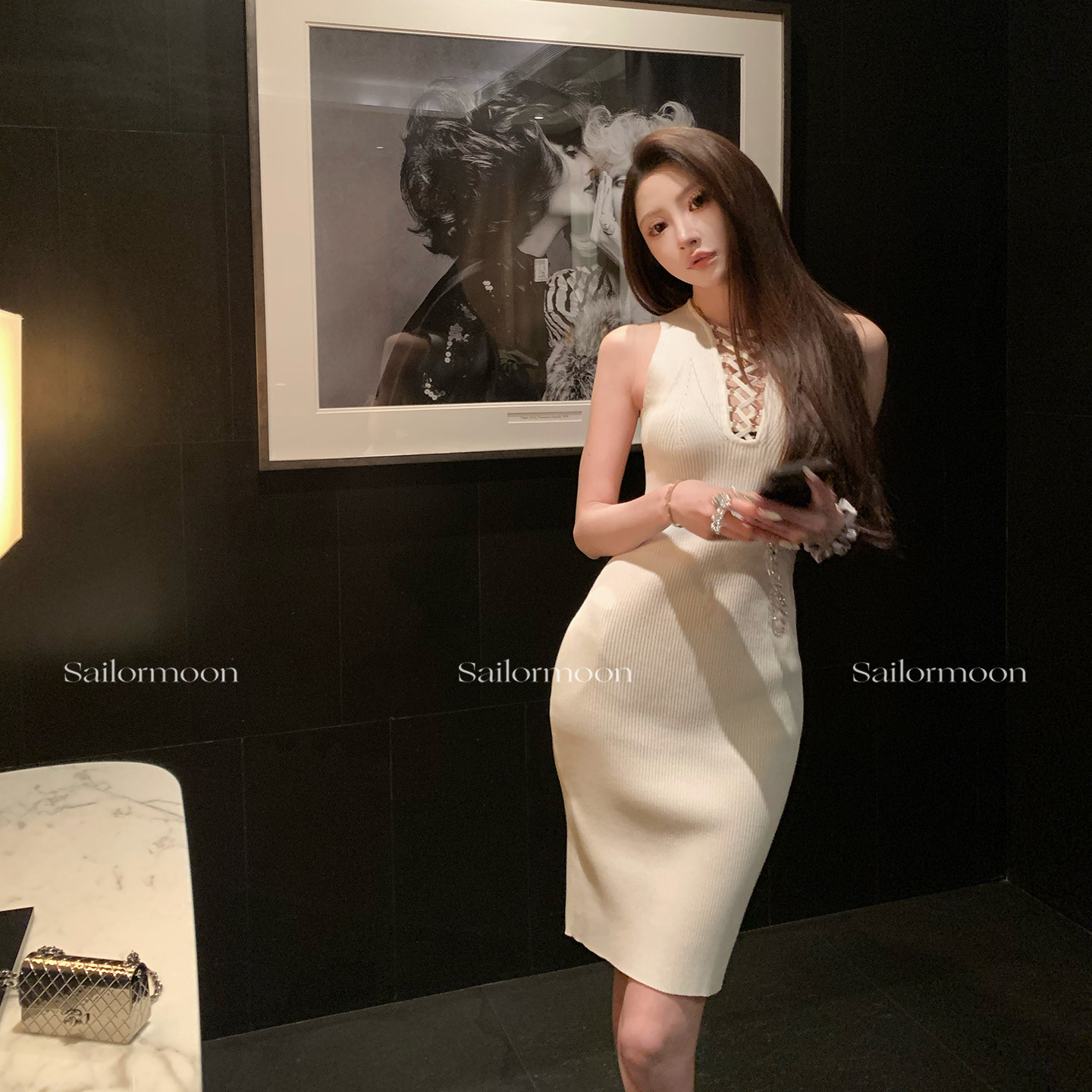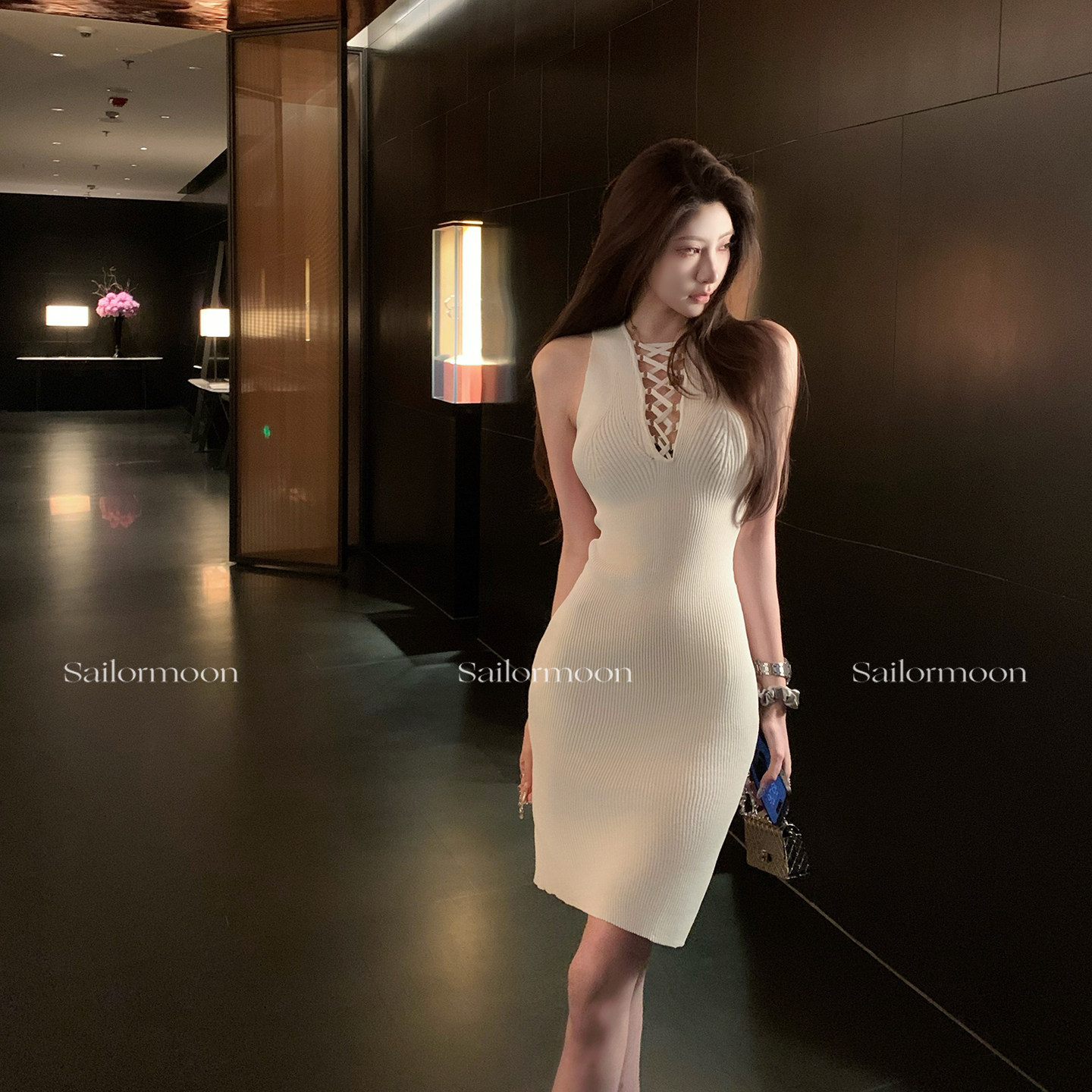 📚 F PROJECT 娇贵浓颜 超绝绑带V领坑条镂空无袖气质弹力针织包臀裙