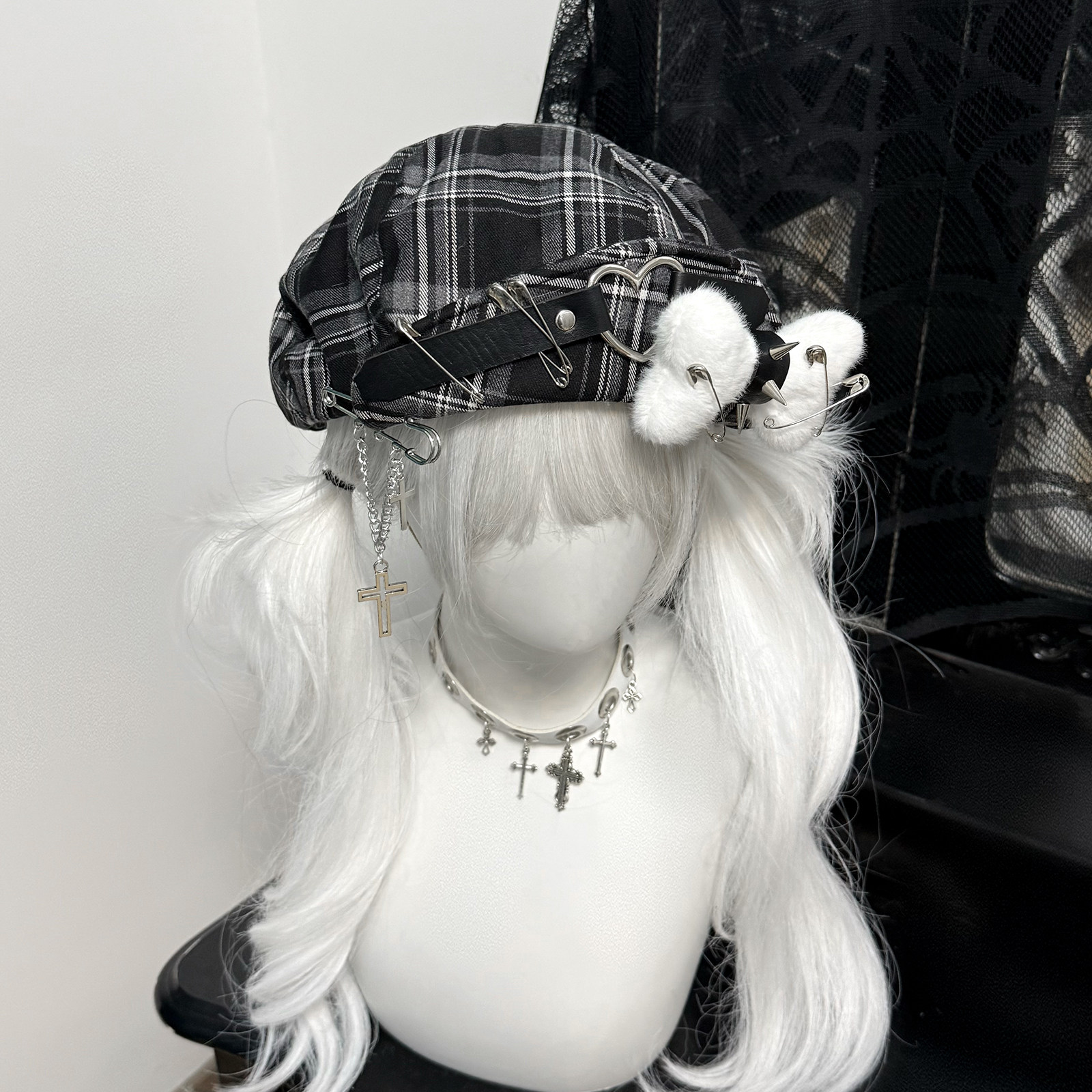 📚 1Gangster Inn原创亚文化贝雷帽金属格子甜酷帽子y2k画家帽云朵帽
