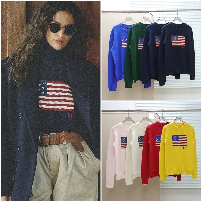 📚 美式老钱风蓝标 女款 星条旗提花圆领长袖针织毛衣 E595