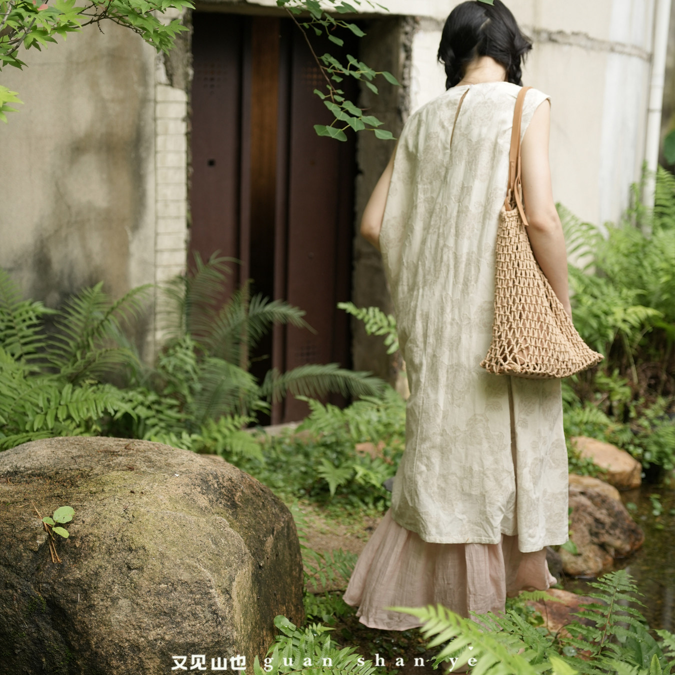 📚 又见山也|新中式棉麻肌理提花叠穿设计优雅米白色无袖四季连衣裙