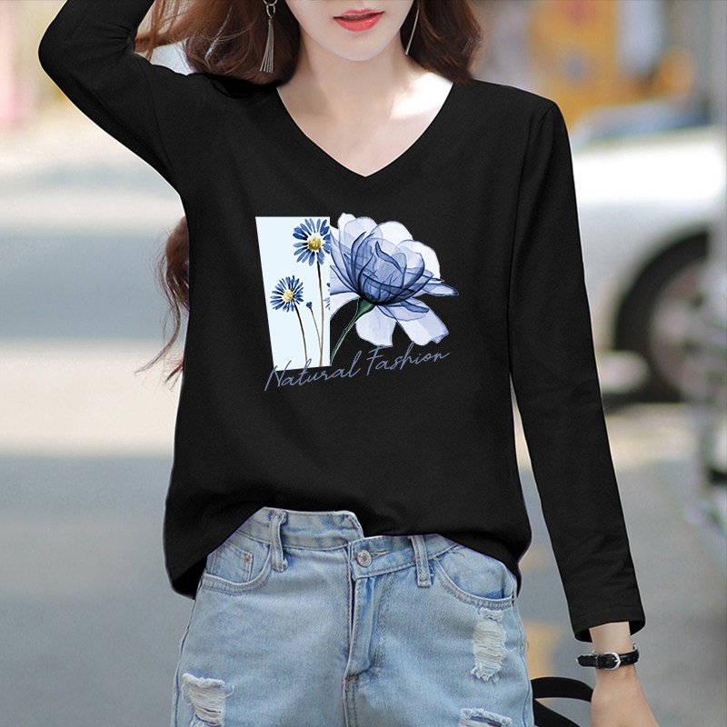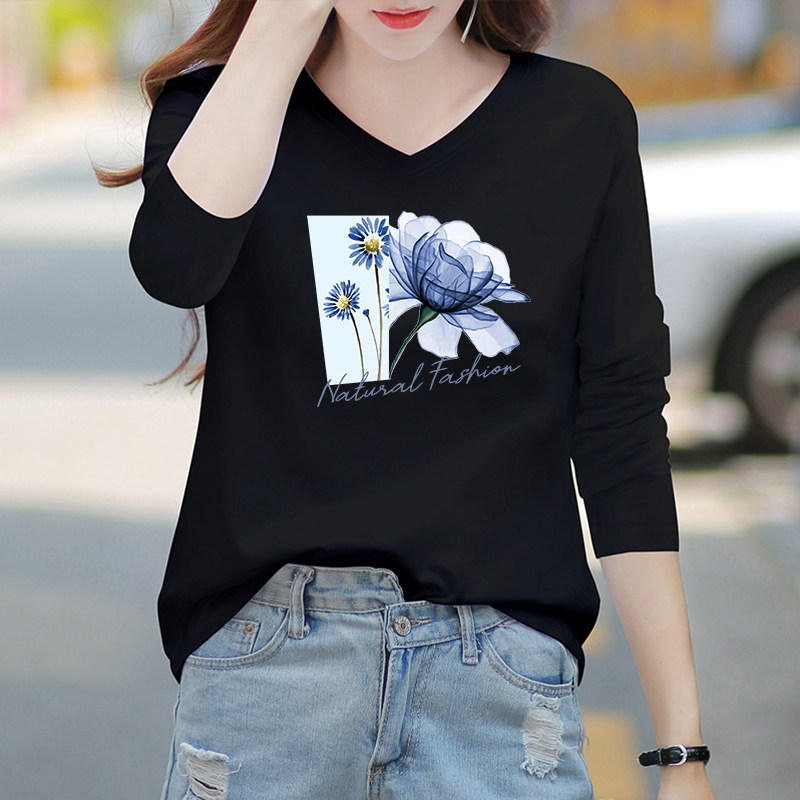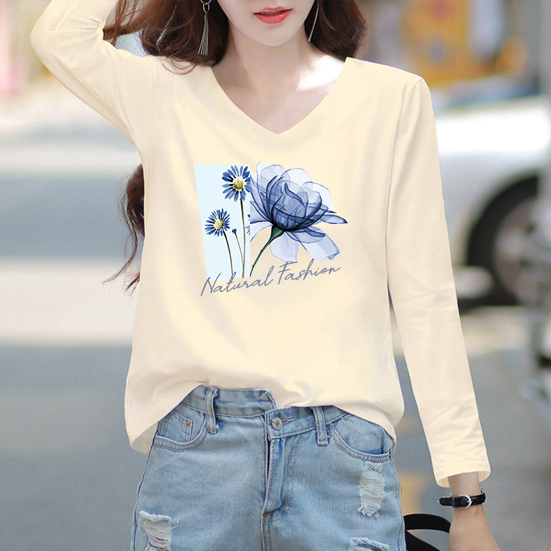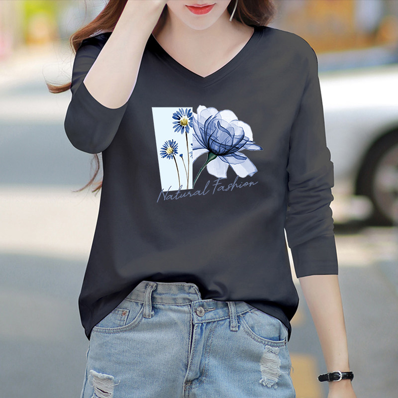 📚 棉质2025新款内搭打底衫烟灰色v领t恤女宽松长袖正肩洋气印花上衣