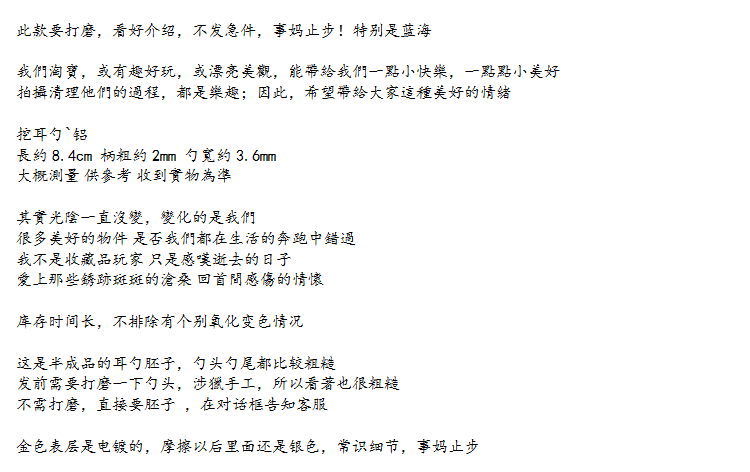 07¥ MF937 EwwTUKxNti7¥ https://m.tb.cn/h.7AwE69R 「Ear pick」九十年代 铝制挖耳勺 Aluminium薄掏耳勺 港式耳扒棍 --------------------- 【原售价】36.7元 【现售价】18.3元。
