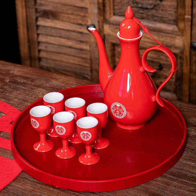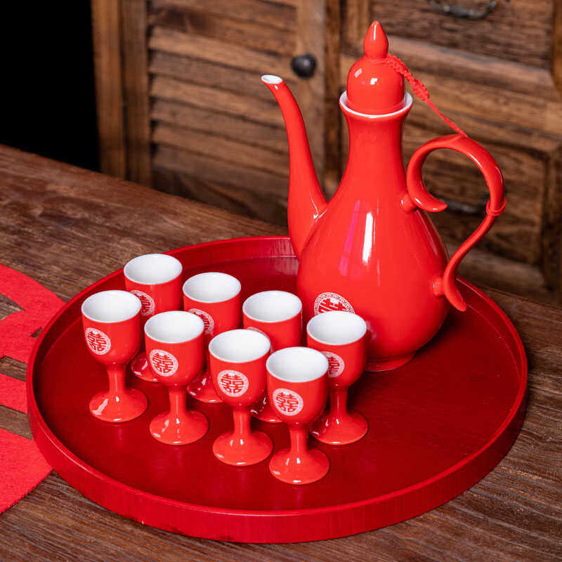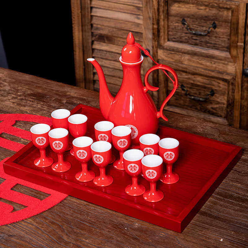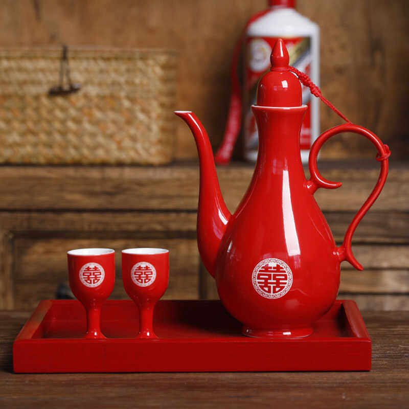 📚 陶瓷白酒杯传统酒壶婚庆高脚杯家用烈酒小号一口杯结婚喜红交杯酒