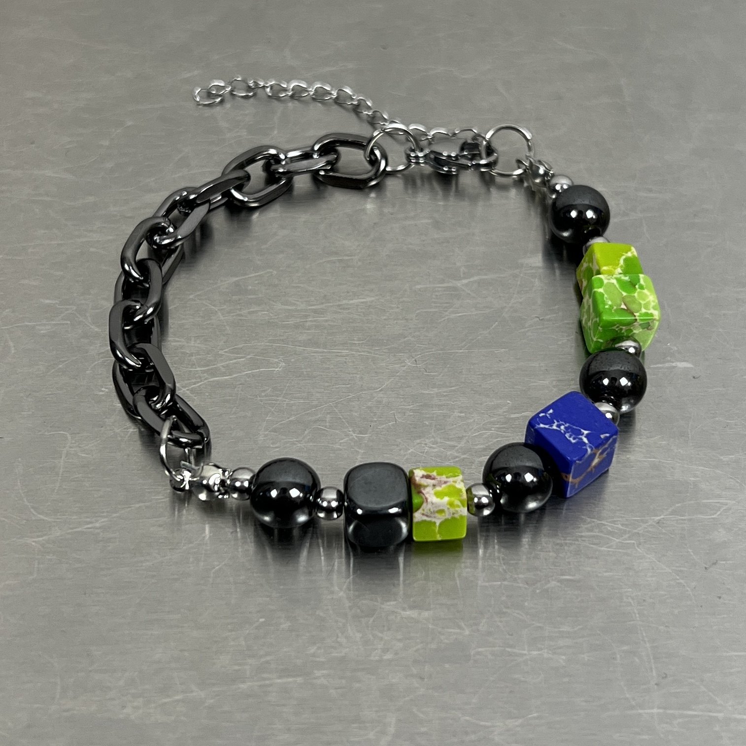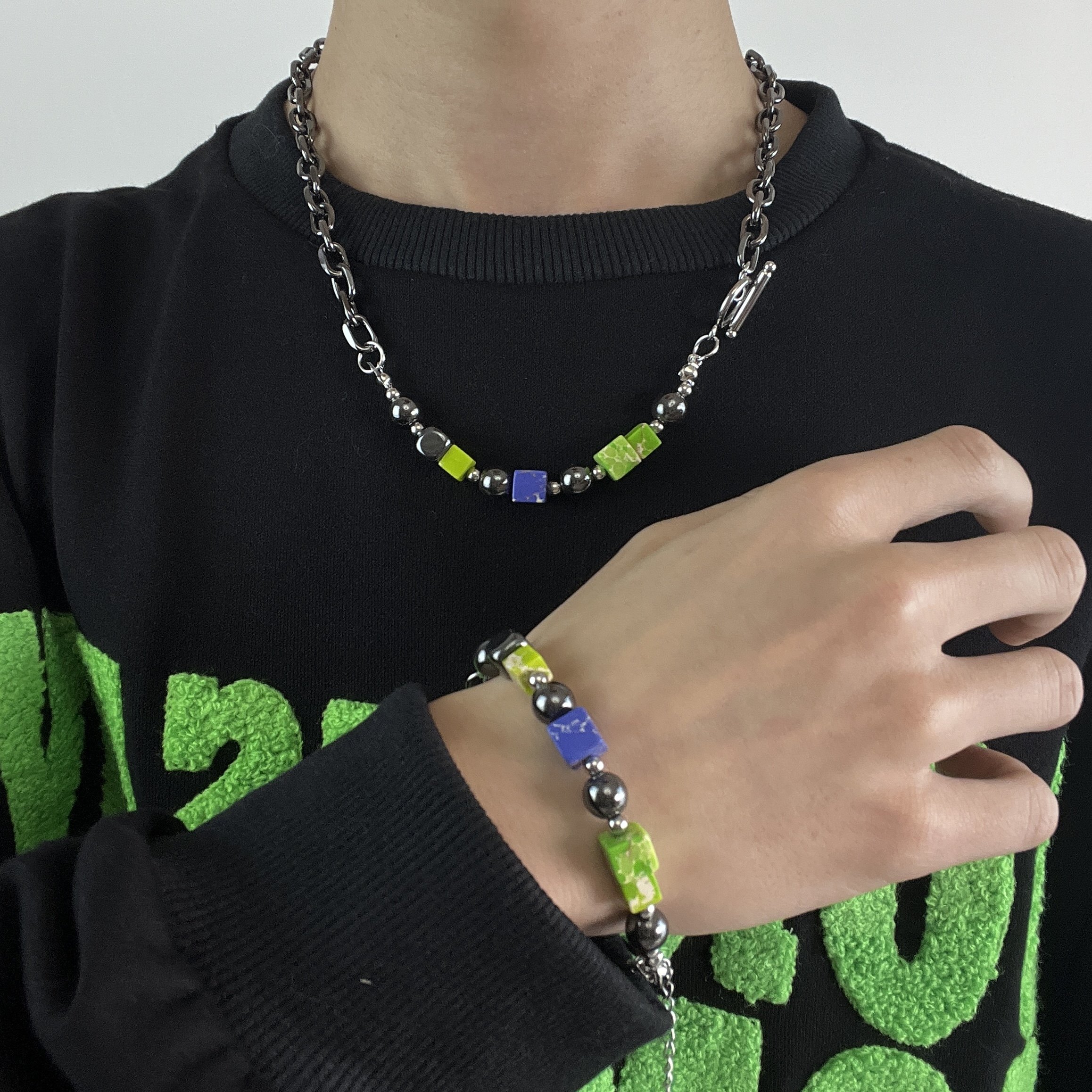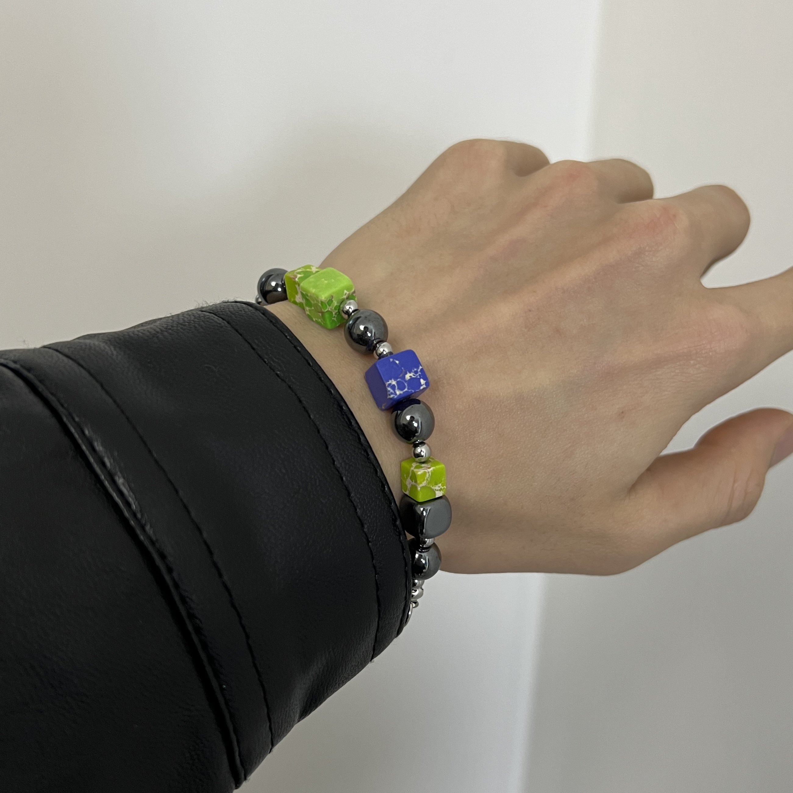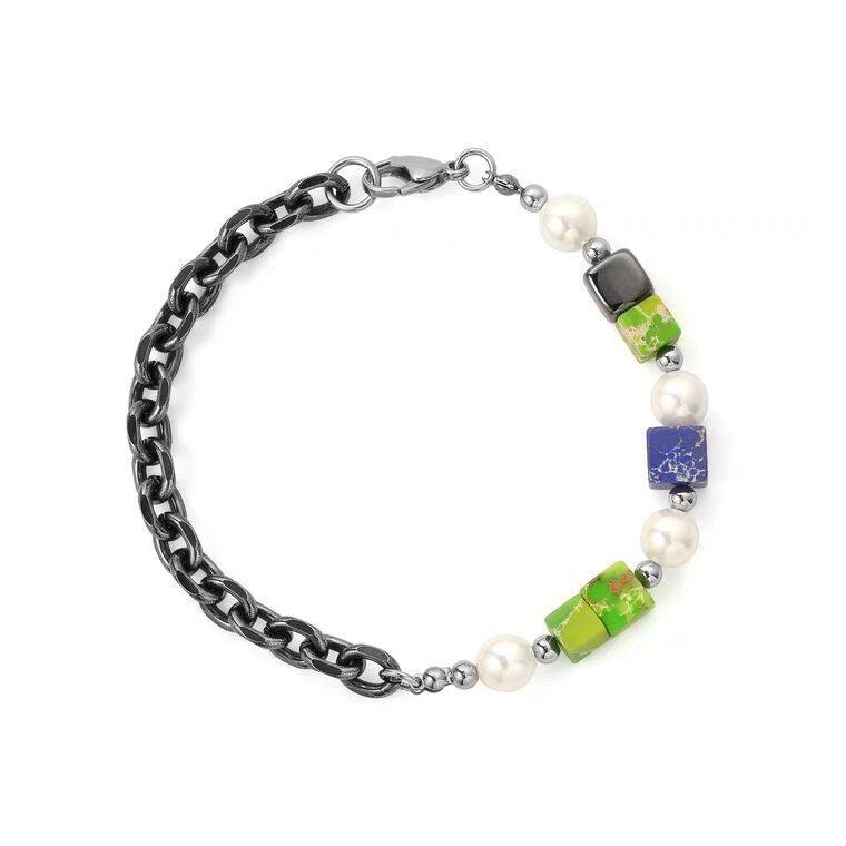 📚 潮牌古巴手链男女ins轻奢小众 钛钢复古彩色方块拼接黑珍珠手饰品