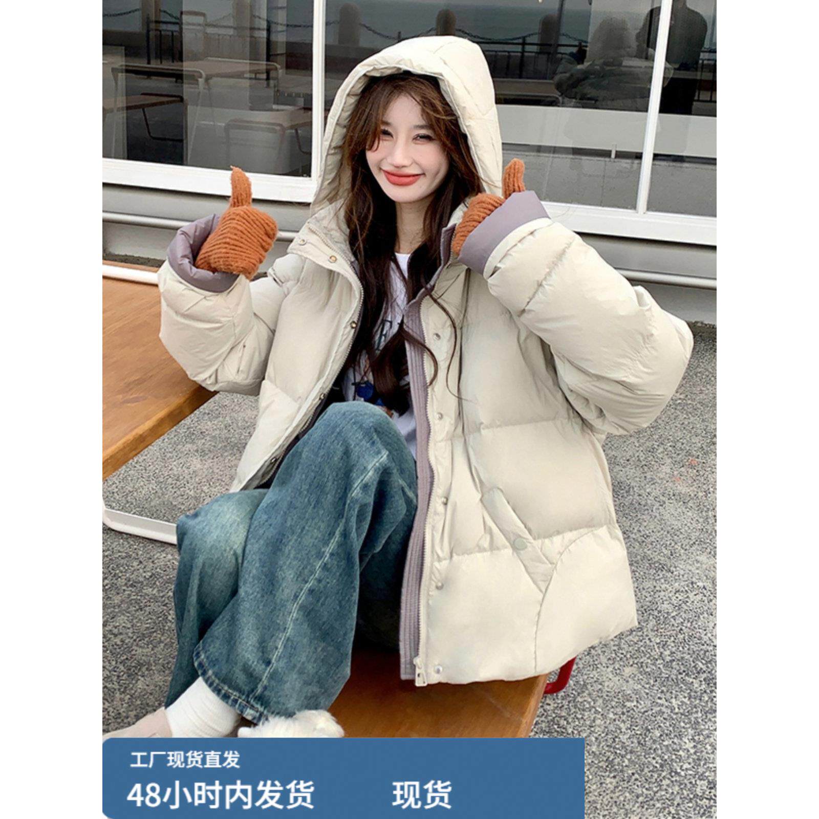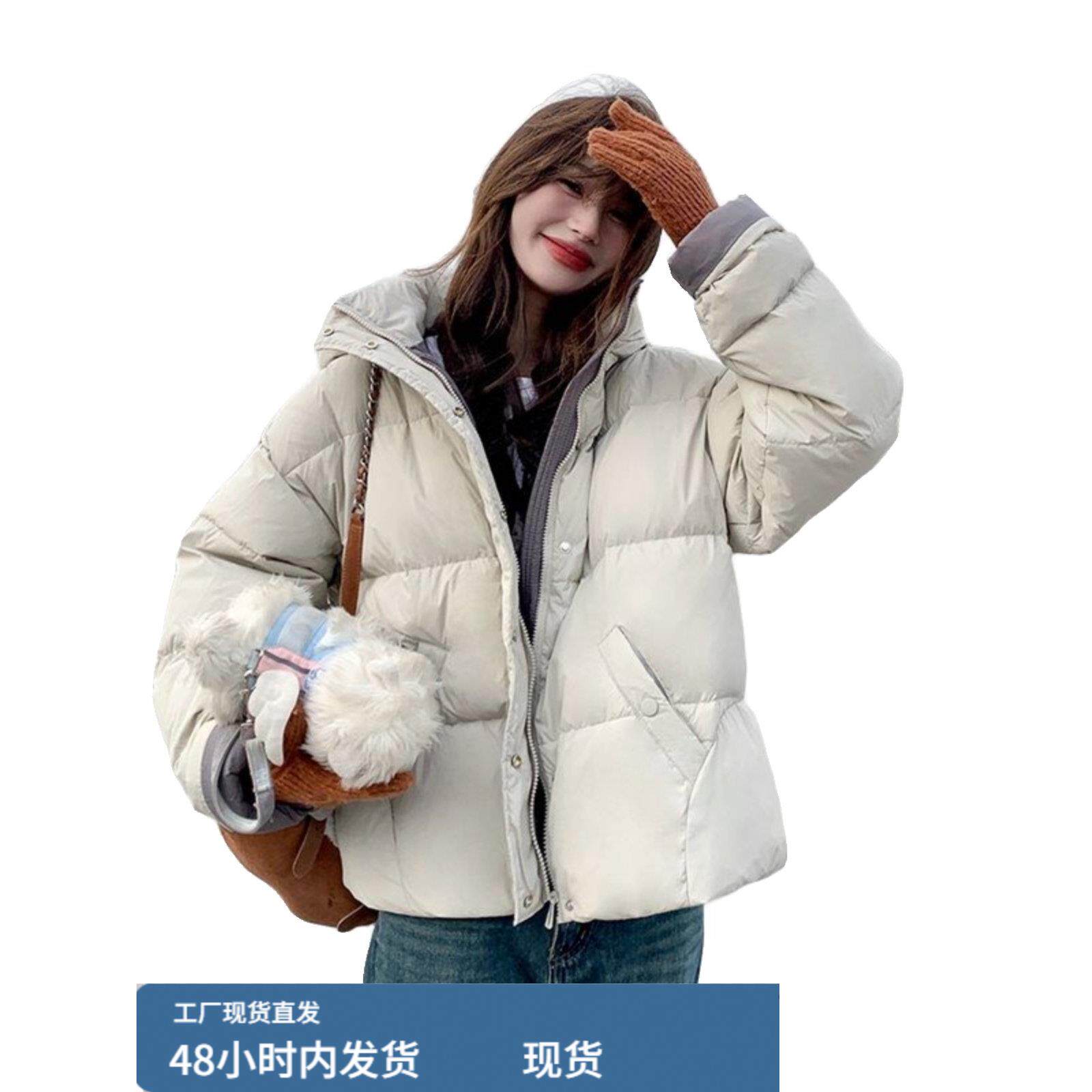 📚 米白色短款羽绒服女2025年新款冬季韩版宽松加厚连帽小个子面包服
