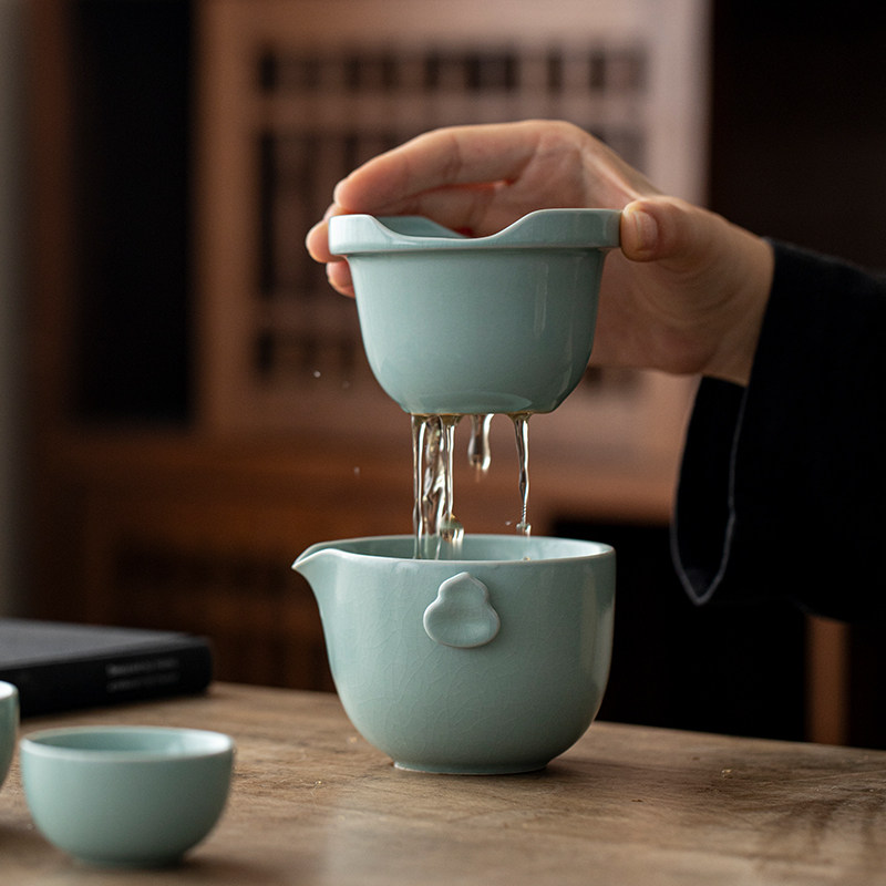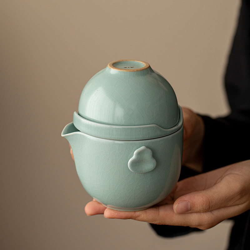 📚 汝山明汝瓷葫芦茶具套组礼盒 一壶三杯带茶漏开片可养可定制