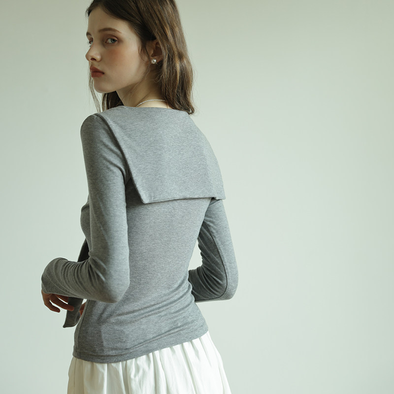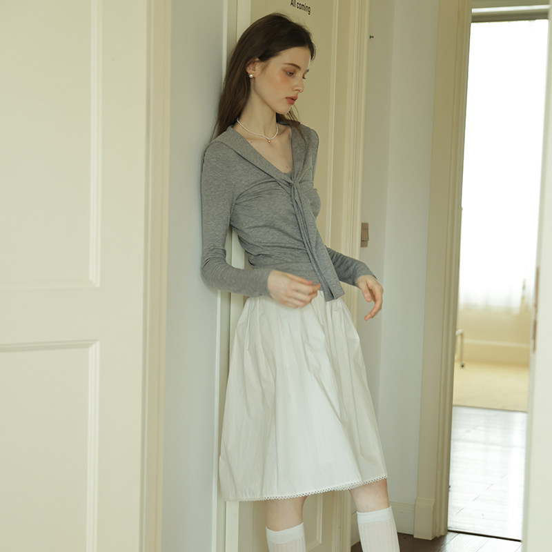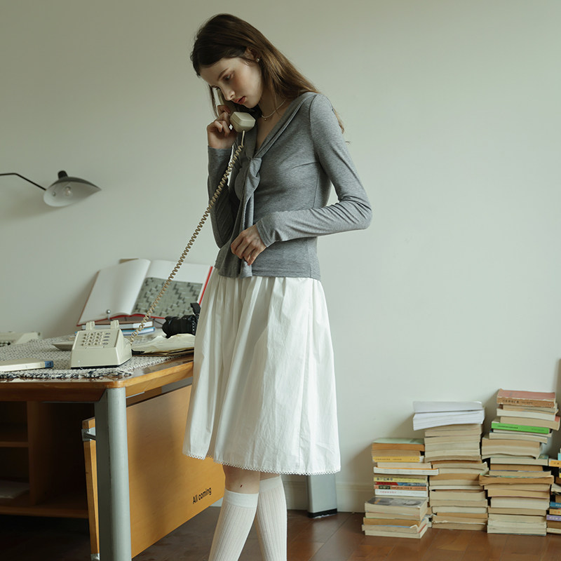 📚 春也白海军领轻柔天丝羊毛飘带长袖T恤女春新款设计感V领通勤上衣