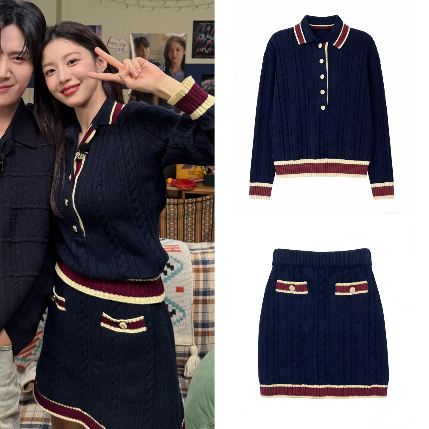 📚 爱情怎么翻译高允真同款小香风撞色polo领绞花针织上衣半身裙套装