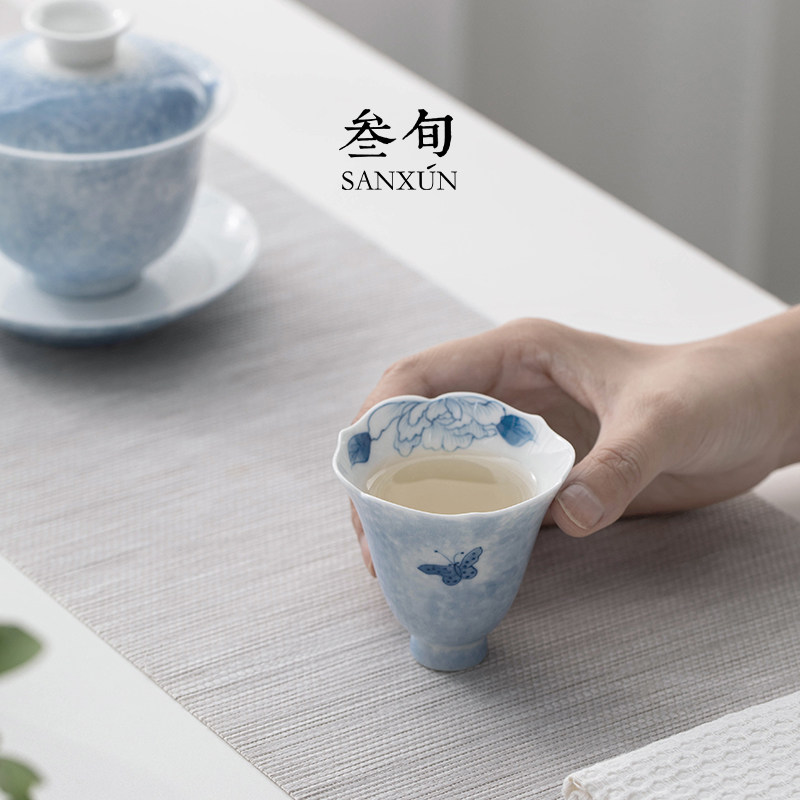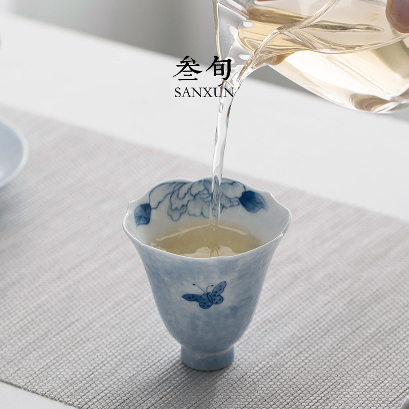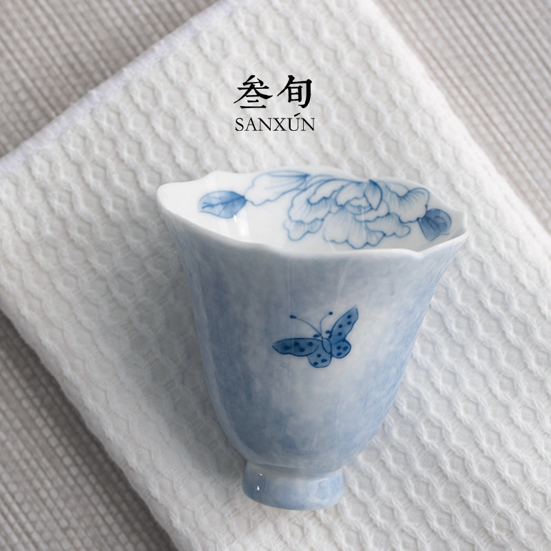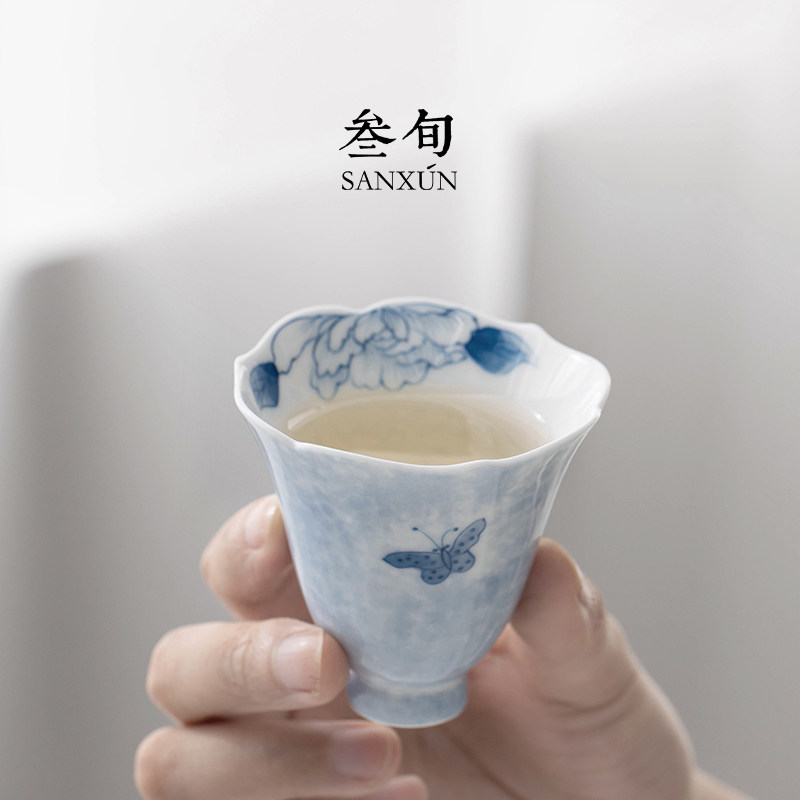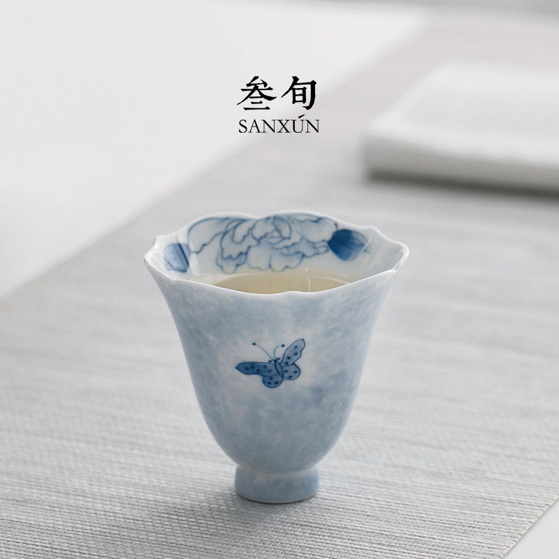 📚 叁旬手绘蝶恋花茶杯闻香主人杯陶瓷家用单杯个人专用花瓣品茗杯子