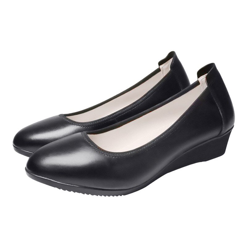 📚 高铁乘务员坡跟工作鞋软底黑色真皮职业鞋子坡跟软底鞋航班鞋