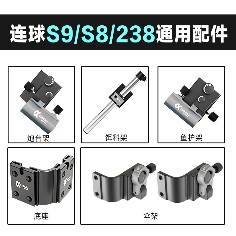 📚 连球钓箱铝合金配件S9S8炮台座鱼护座饵料架伞架三件套铝镁配件