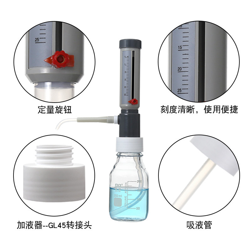 📚 闽玻瓶口分液器套筒式可调定量加液器GL45丝口瓶连续通用加液器透明/棕色加液瓶250/500/1000ml