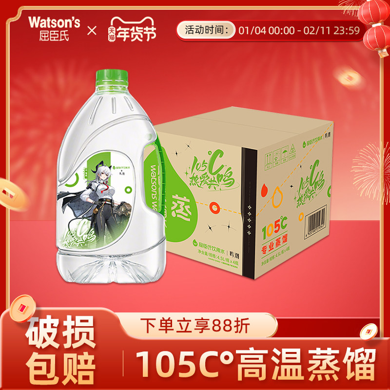 📚 屈臣氏蒸馏水4.5L*4桶家庭装桶装水煮饭泡茶饮用水一整箱
