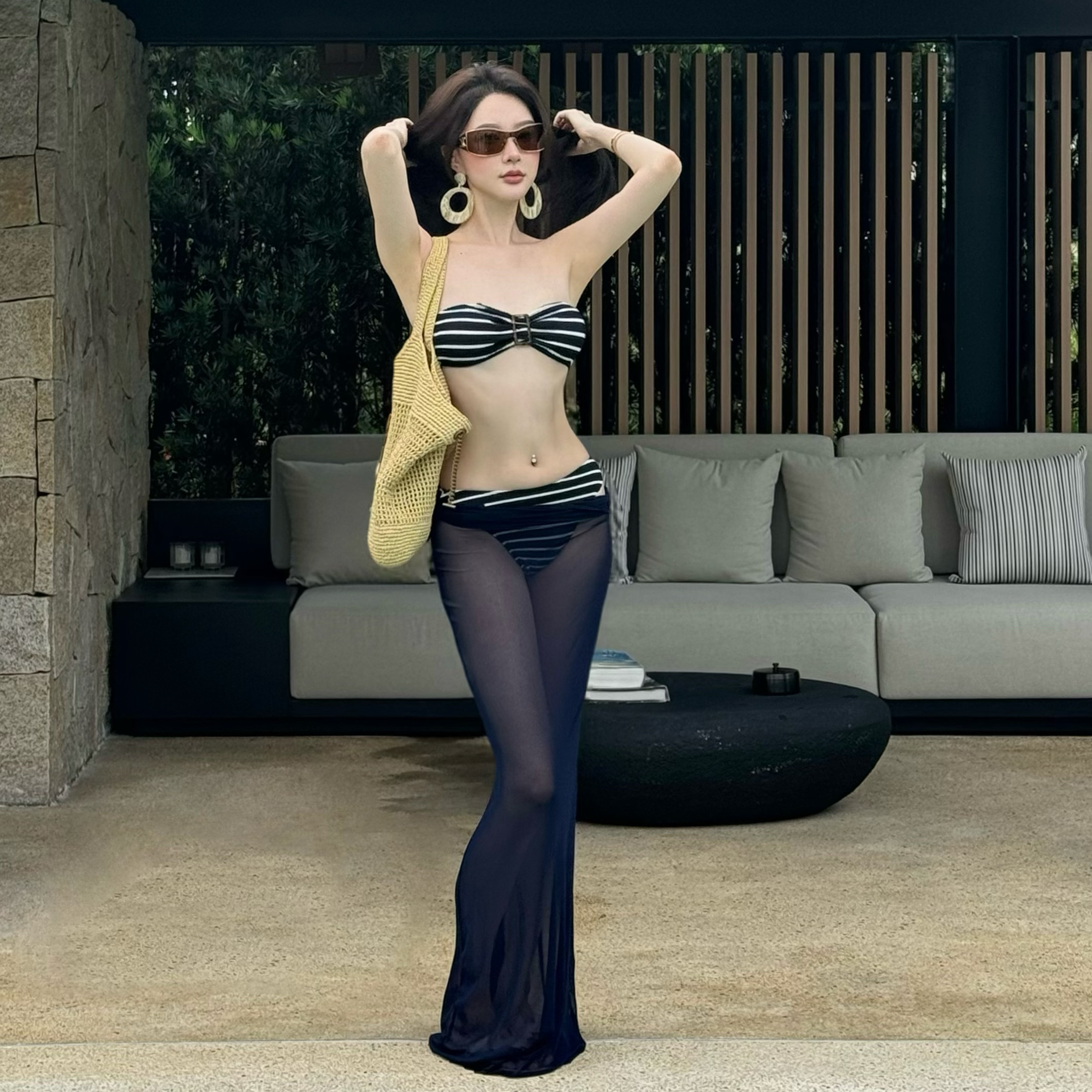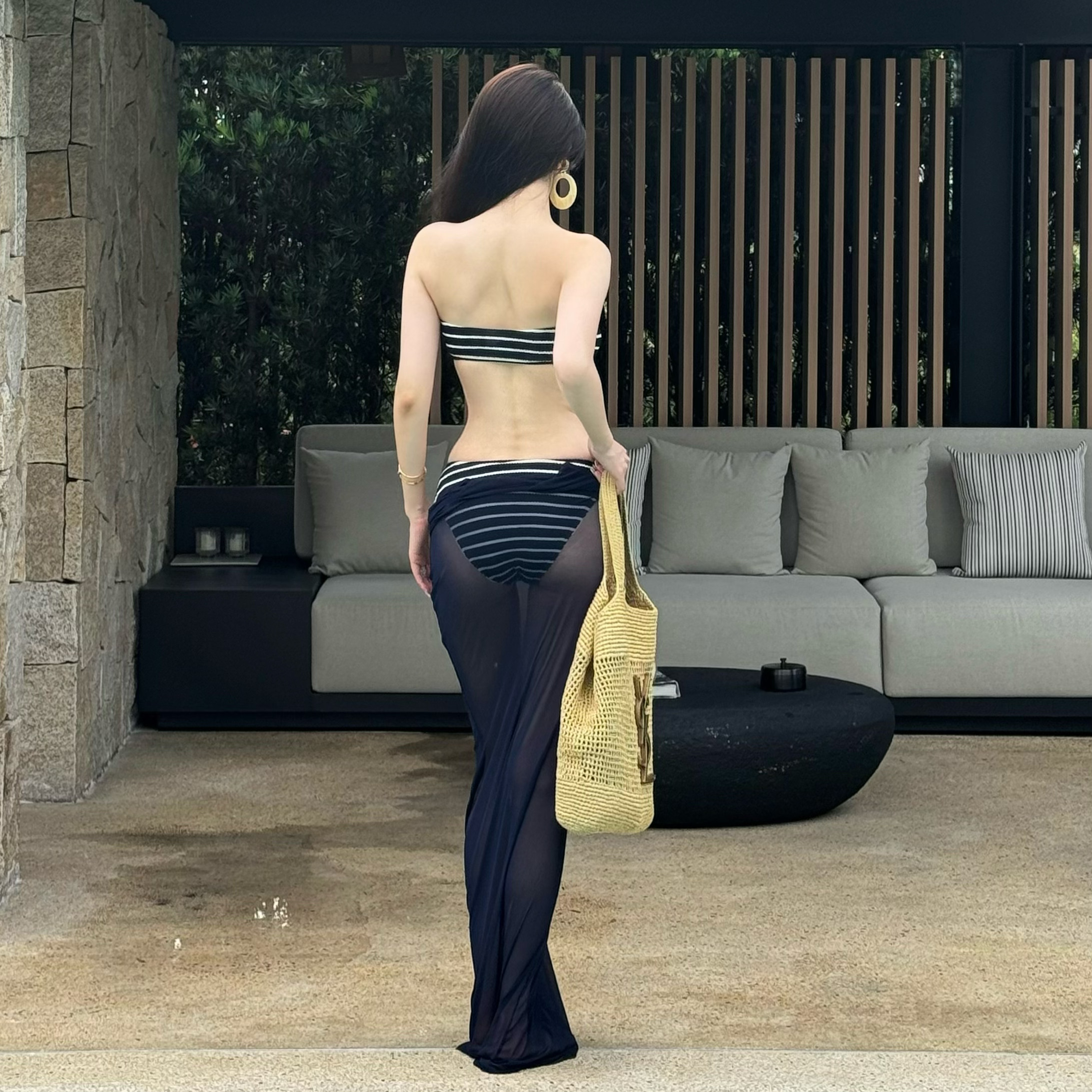 📚 网红同款性感辣妹透视薄纱藏蓝长裙条纹比基尼套装海边度假泳衣女