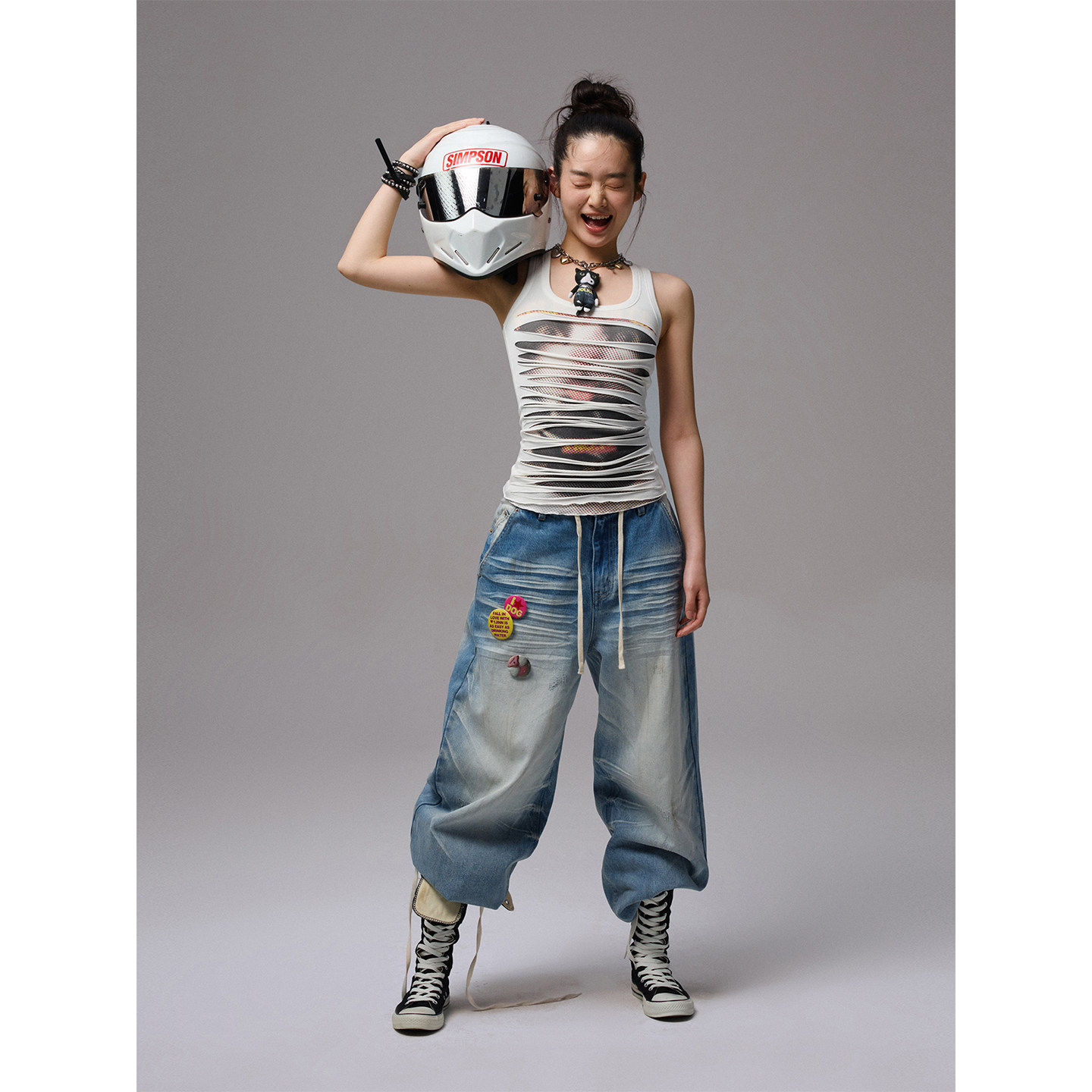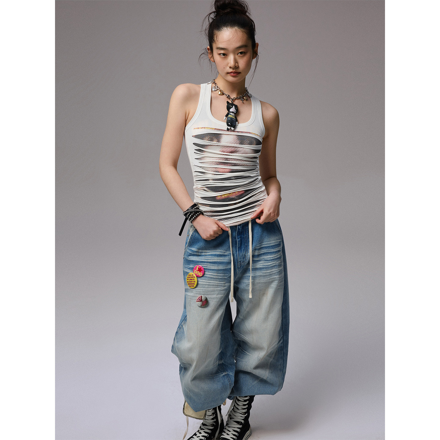 📚 【全昭弥同款】1JINN STUDIO 不规则破洞机车猫印花双层工字背心
