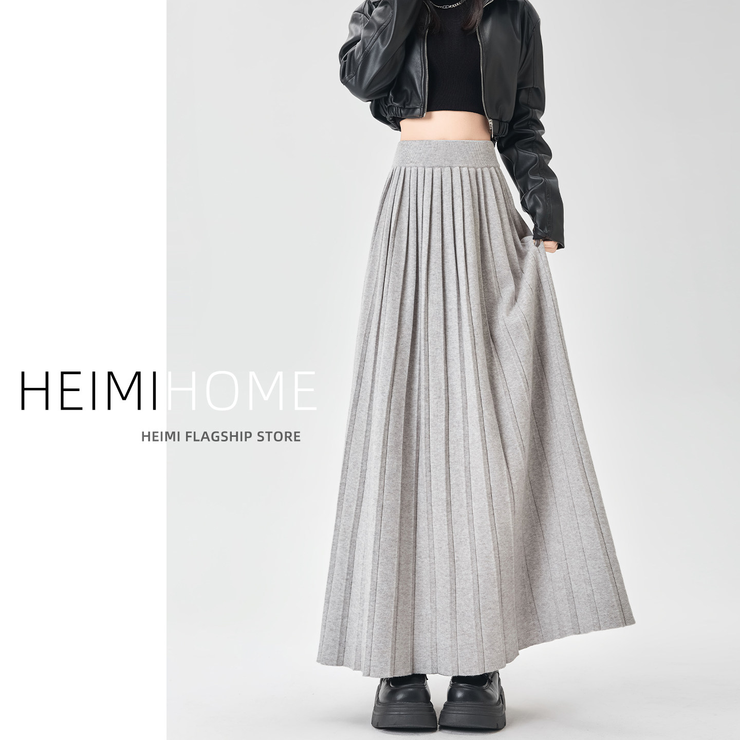 📚 深灰色百褶半身裙女秋冬松紧高腰到脚踝大摆伞裙中长款加厚针织裙