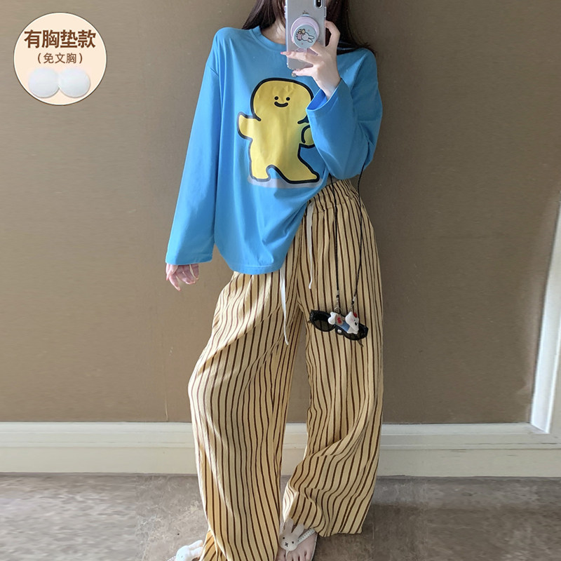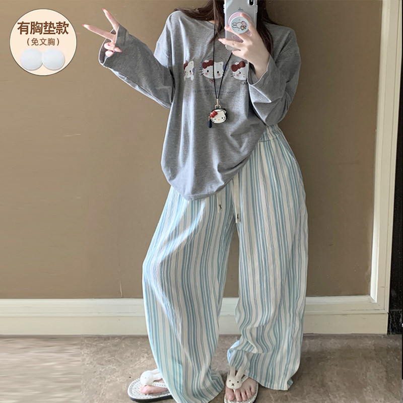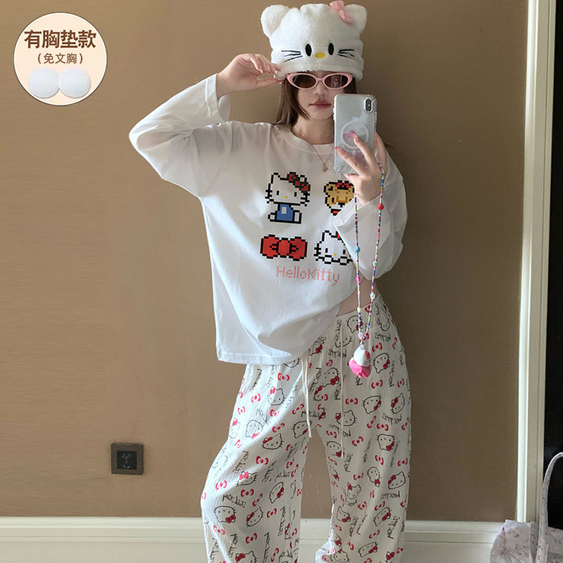 📚 卡通KT猫睡衣女款秋季带胸垫长袖纯棉2025新款防凸点可外穿家居服