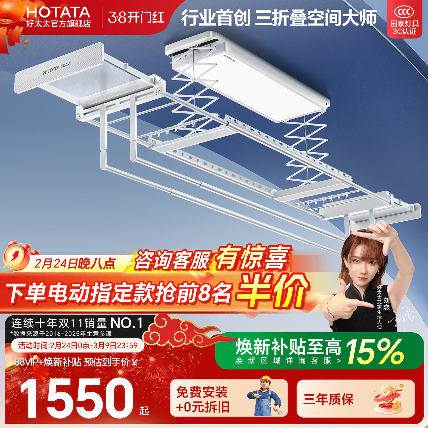📚 【重磅新品】好太太三折叠空间大师电动晾衣架家用阳台升降晾衣机