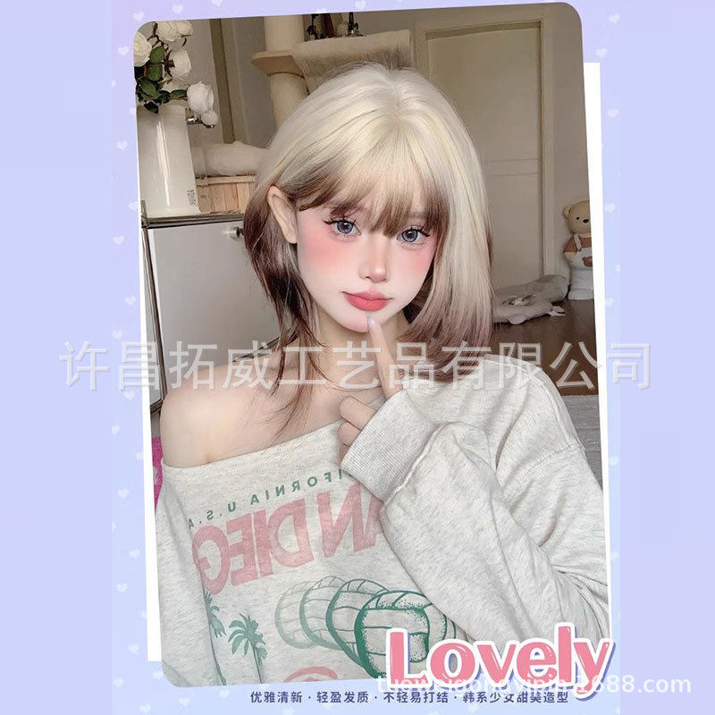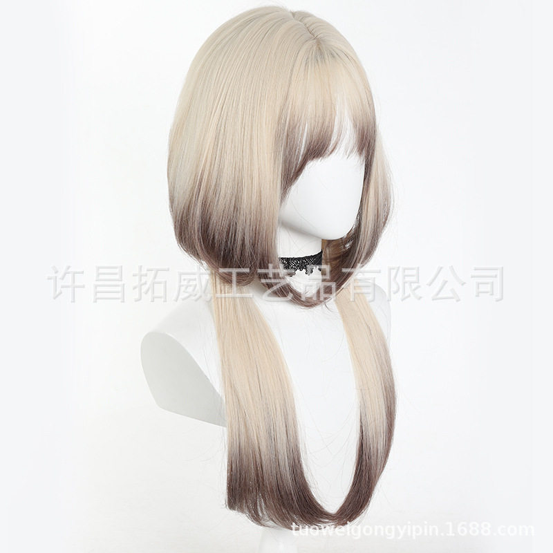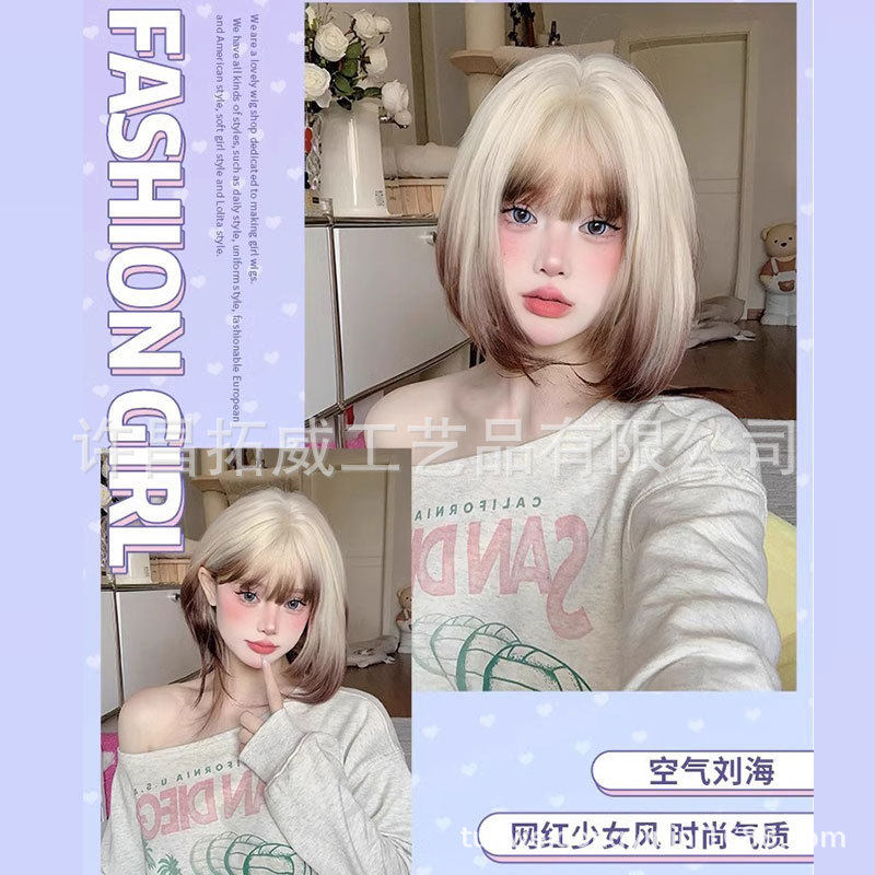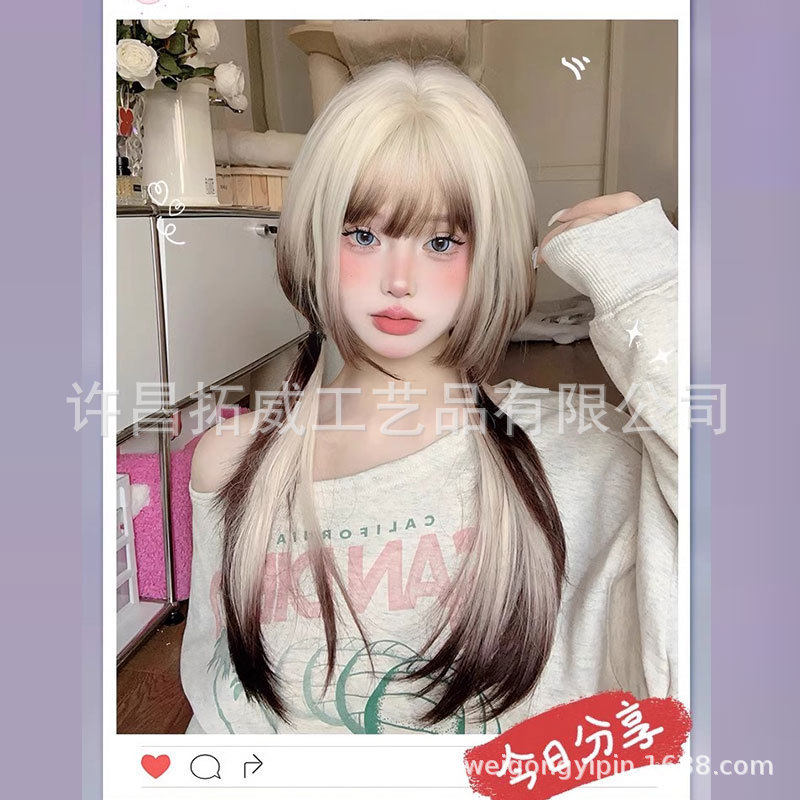 📚 白金色渐变水母头假发全头套女长直发公主切齐刘海高温丝仿真头套