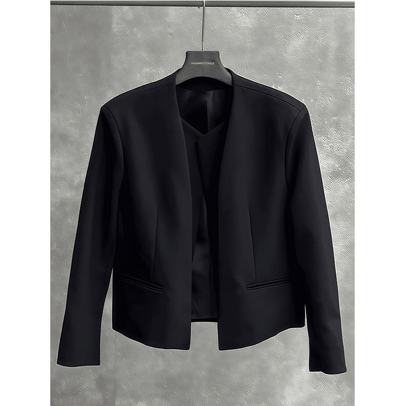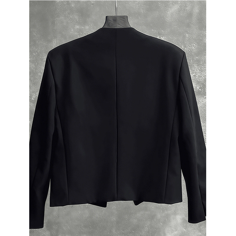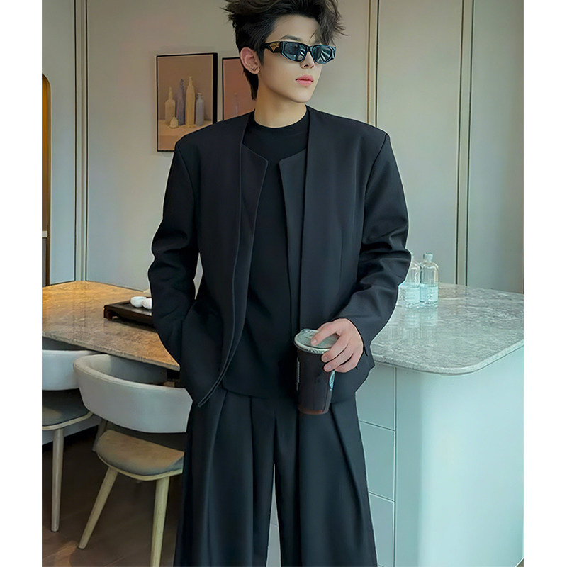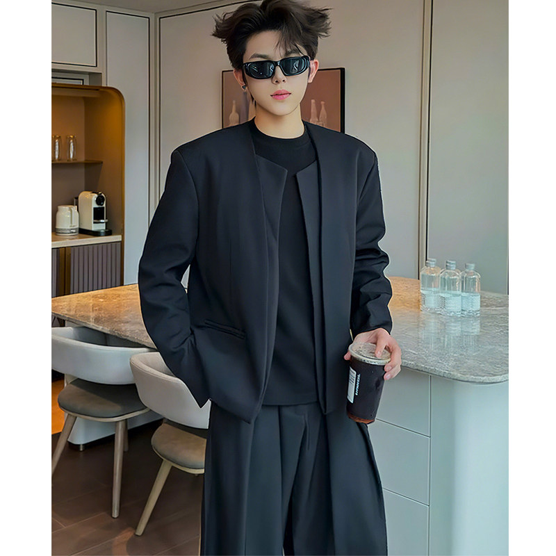 📚 黑色无领垫肩西装外套男款英伦雅痞假两件短款夹克高级感男模穿搭